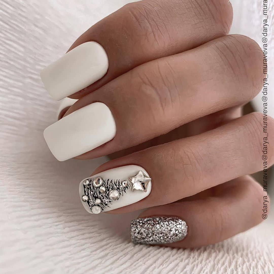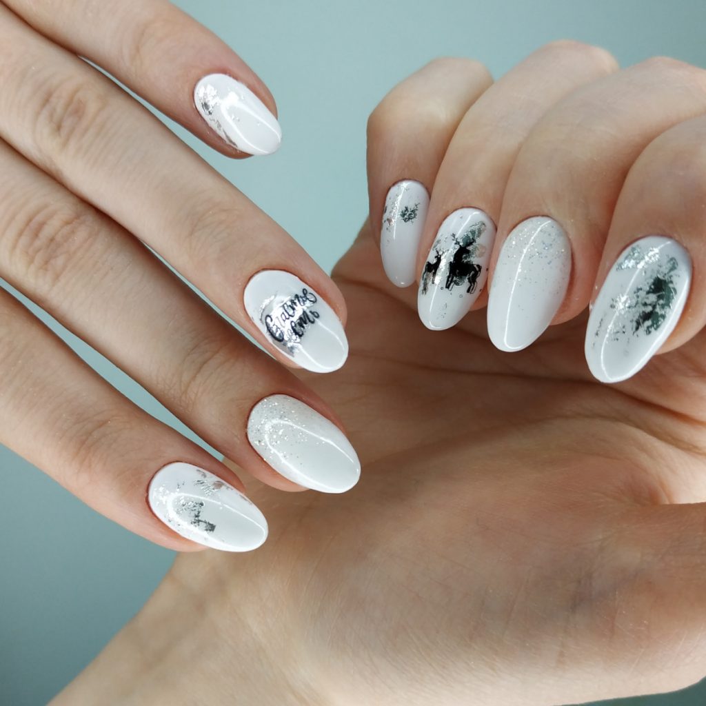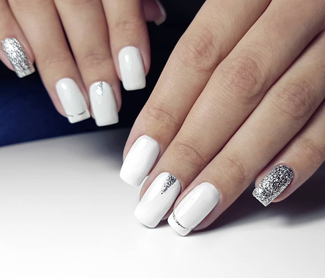 Для яркого, праздничного оформления белый цвет часто сочетают с серебристым или золотистым блеском. Это может быть лак, рассыпной глиттер, фольга или втирка. С их помощью можно выделить рисунок, который соответствует праздничной тематике. К примеру, снежинки, елочные игрушки или же подарки с крупными бантами. Также блестки нередко наносят на всю ногтевую пластину на нескольких ноготках. В то время, как остальные покрывают классическим белым цветом.