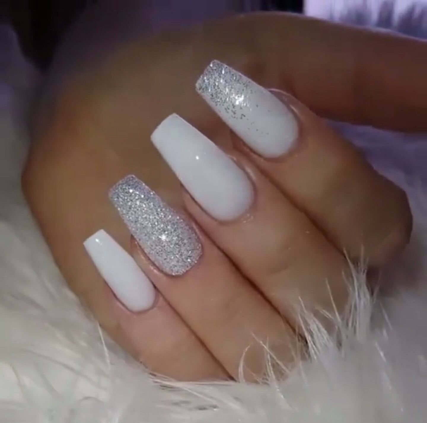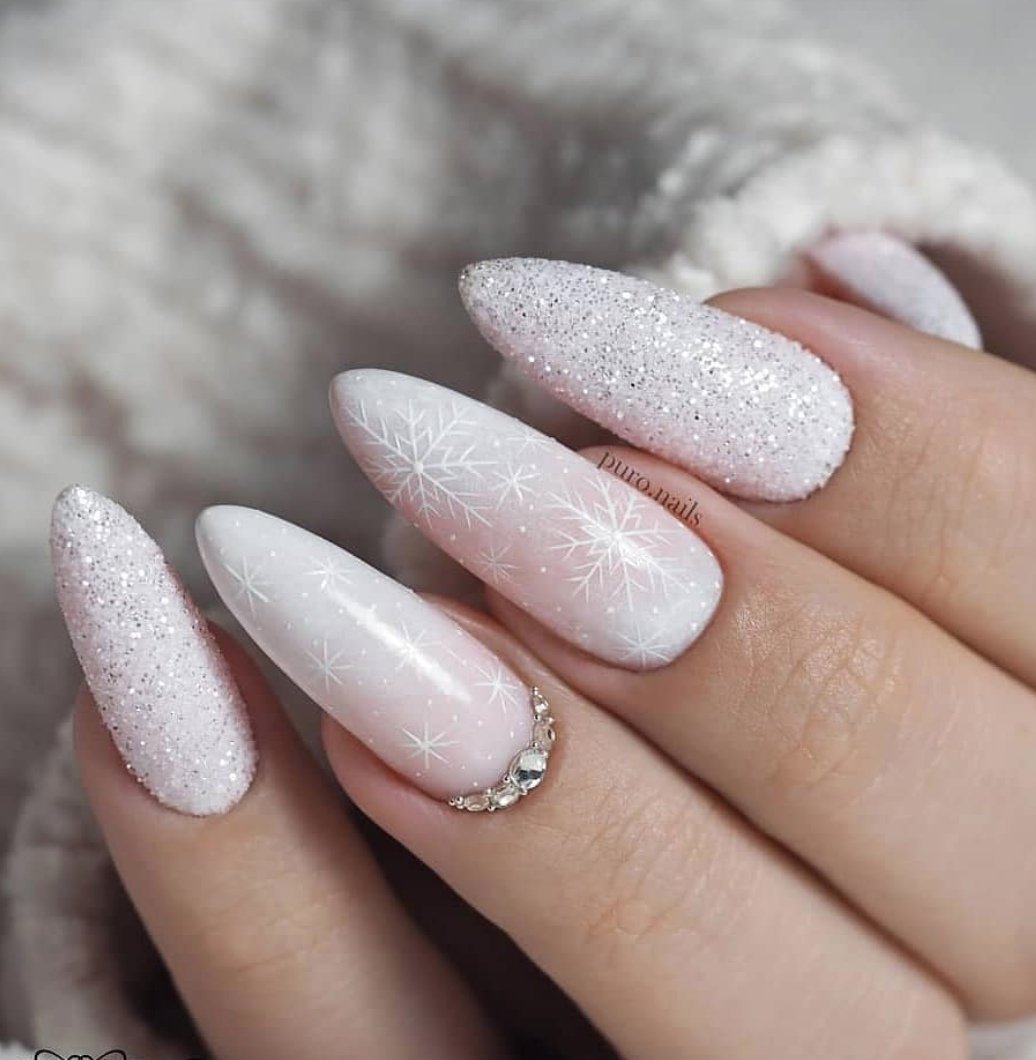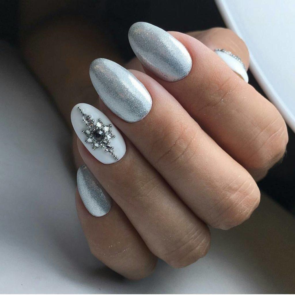 Для яркого, праздничного оформления белый цвет часто сочетают с серебристым или золотистым блеском. Это может быть лак, рассыпной глиттер, фольга или втирка. С их помощью можно выделить рисунок, который соответствует праздничной тематике. К примеру, снежинки, елочные игрушки или же подарки с крупными бантами. Также блестки нередко наносят на всю ногтевую пластину на нескольких ноготках. В то время, как остальные покрывают классическим белым цветом.