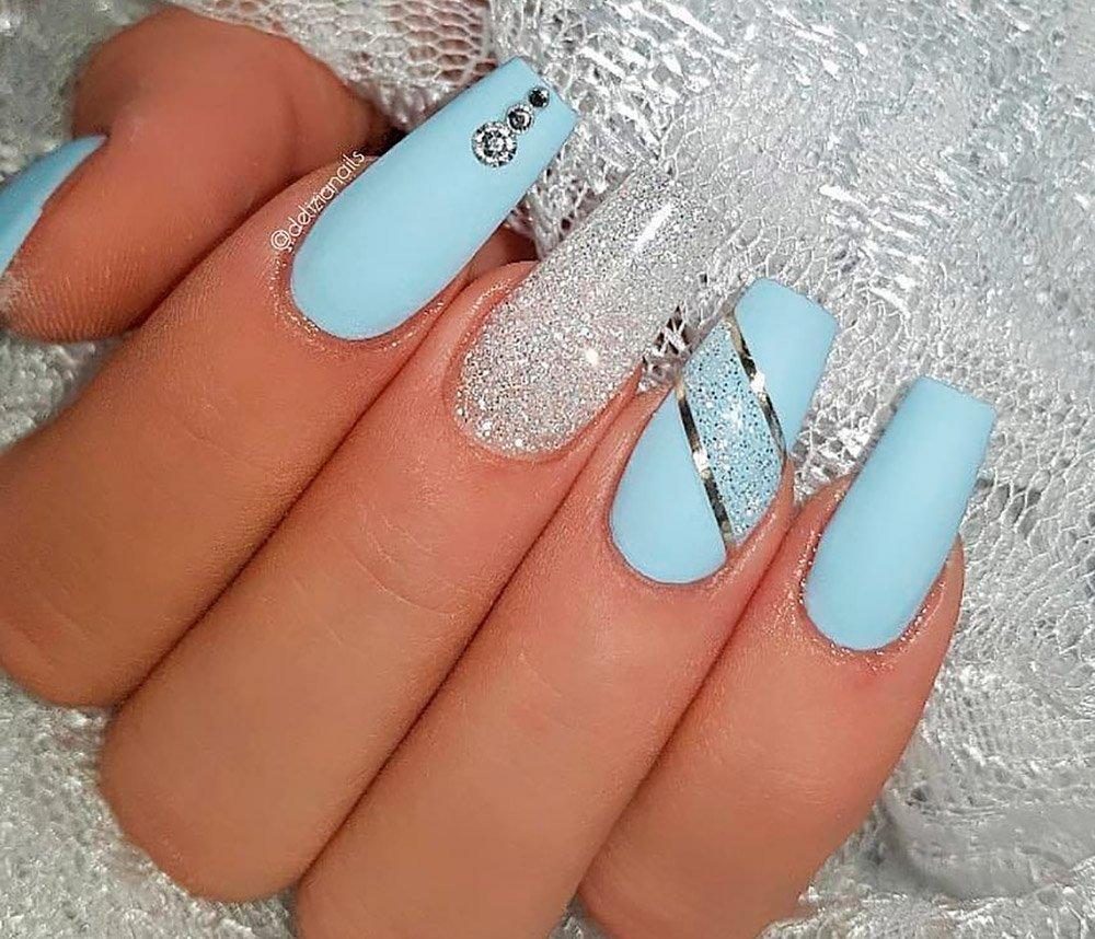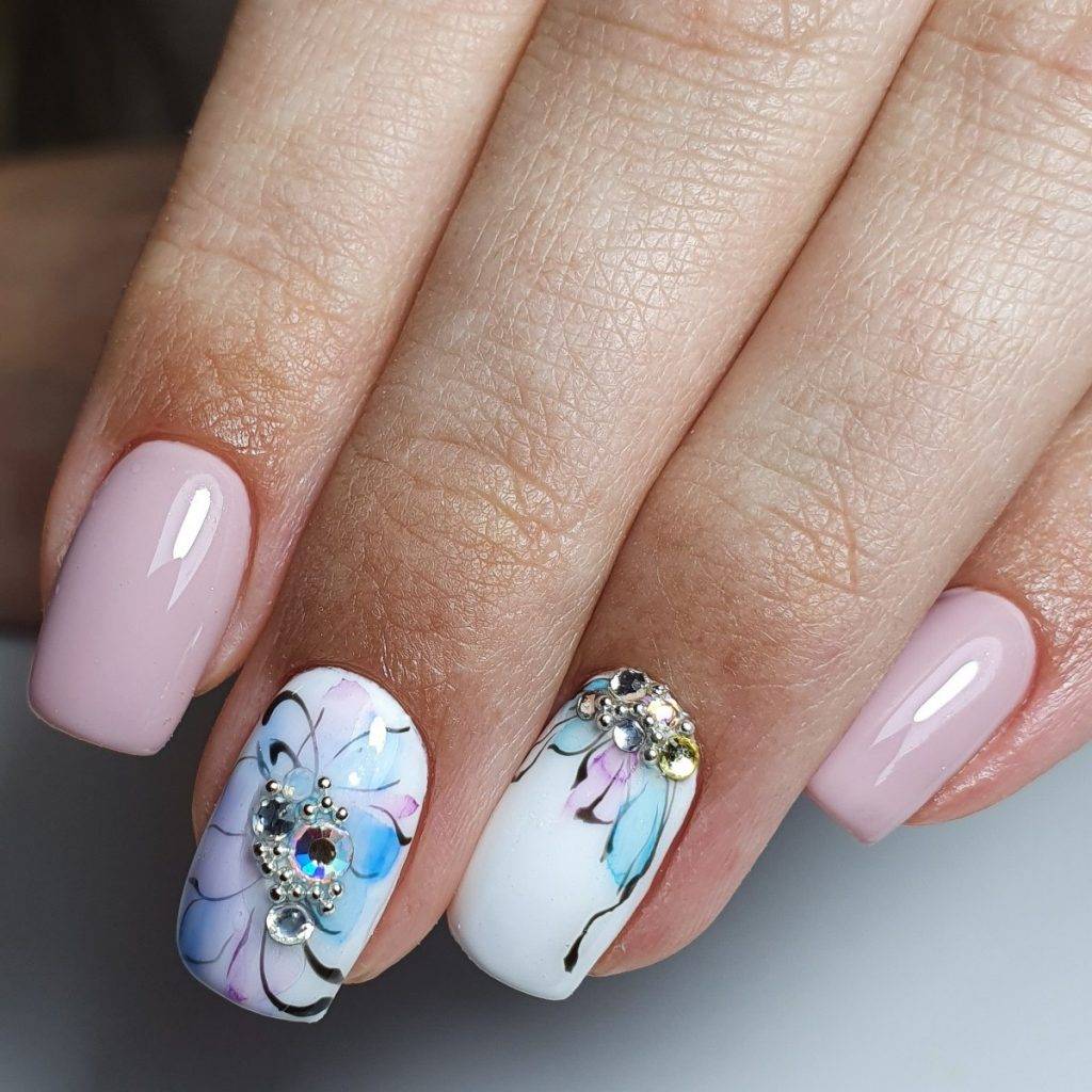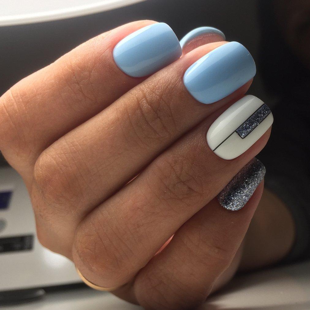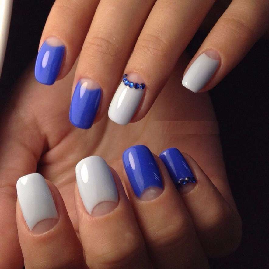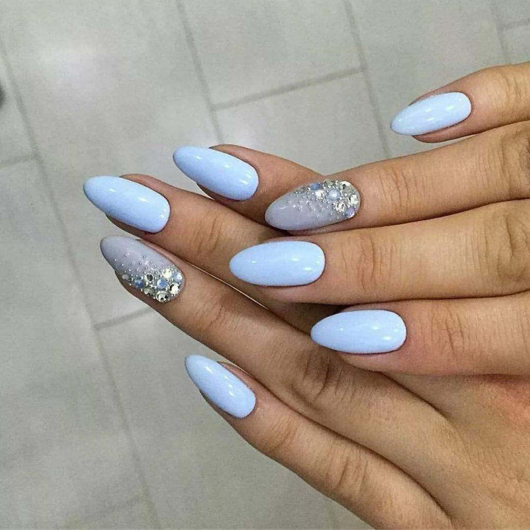Свежее, холодное, но при этом мягкое сочетание оттенков получите, если выберите сочетание с синим оттенком. Идеально для длинных ногтей, но может не менее эффектно смотреться и на коротких ноготочках. По желанию добавьте немного страз или глиттера.