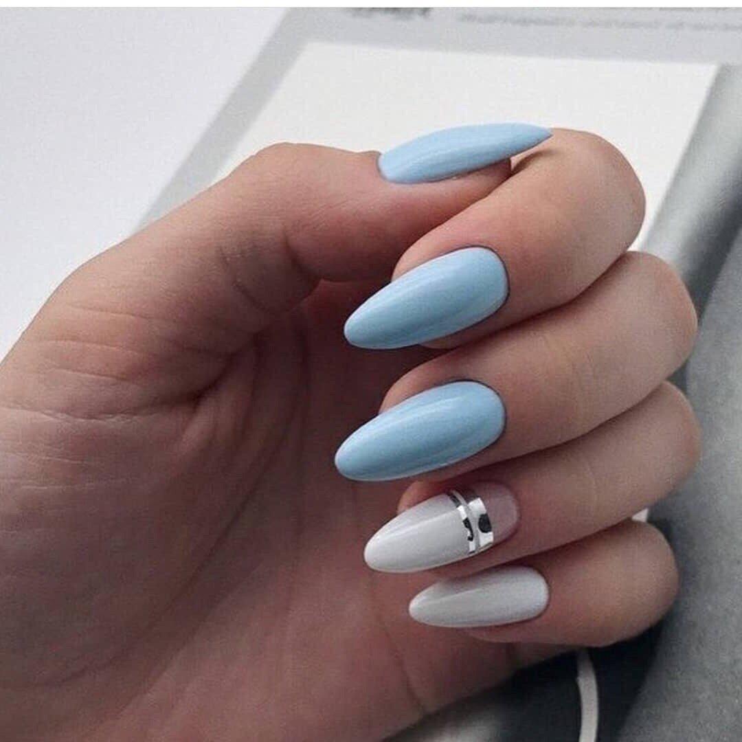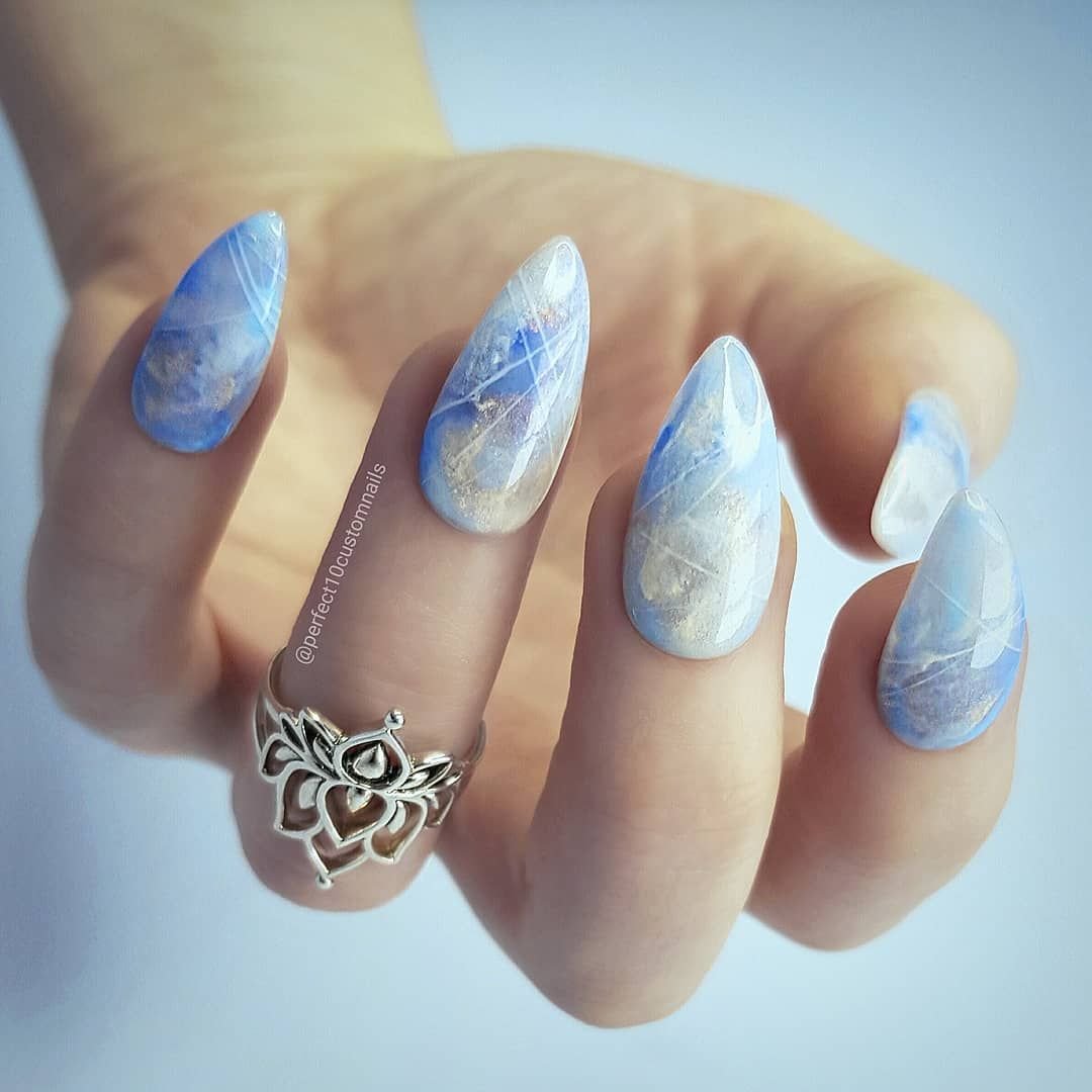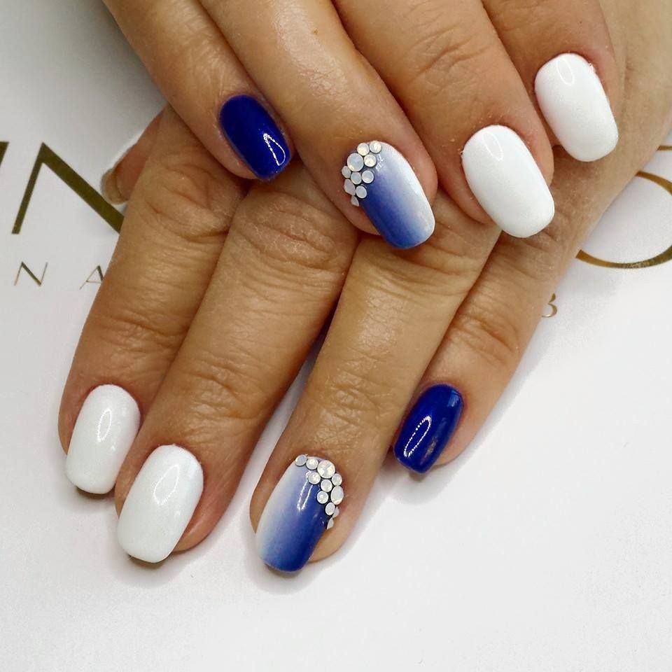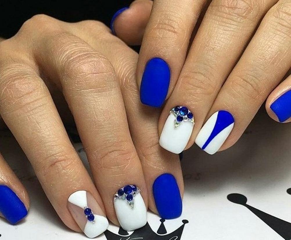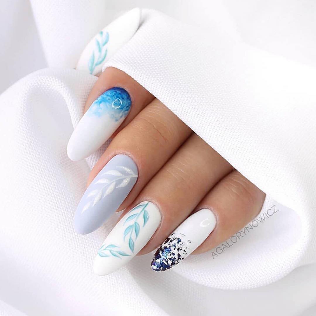 Свежее, холодное, но при этом мягкое сочетание оттенков получите, если выберите сочетание с синим оттенком. Идеально для длинных ногтей, но может не менее эффектно смотреться и на коротких ноготочках. По желанию добавьте немного страз или глиттера.