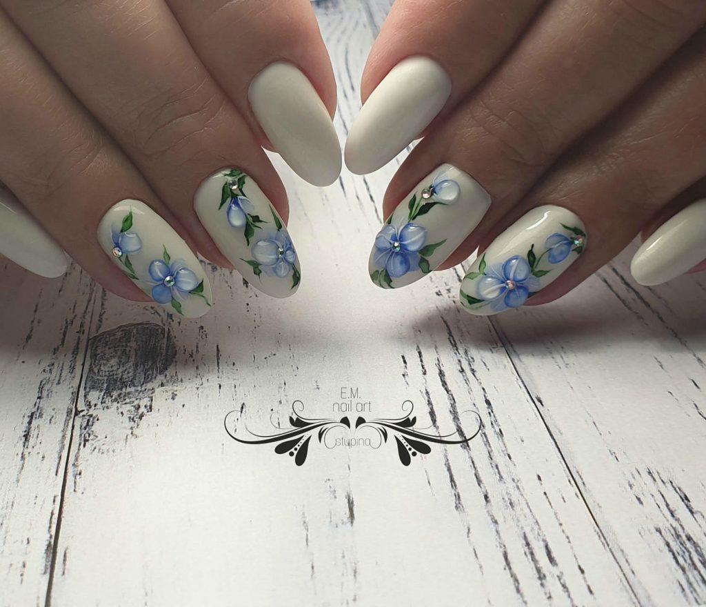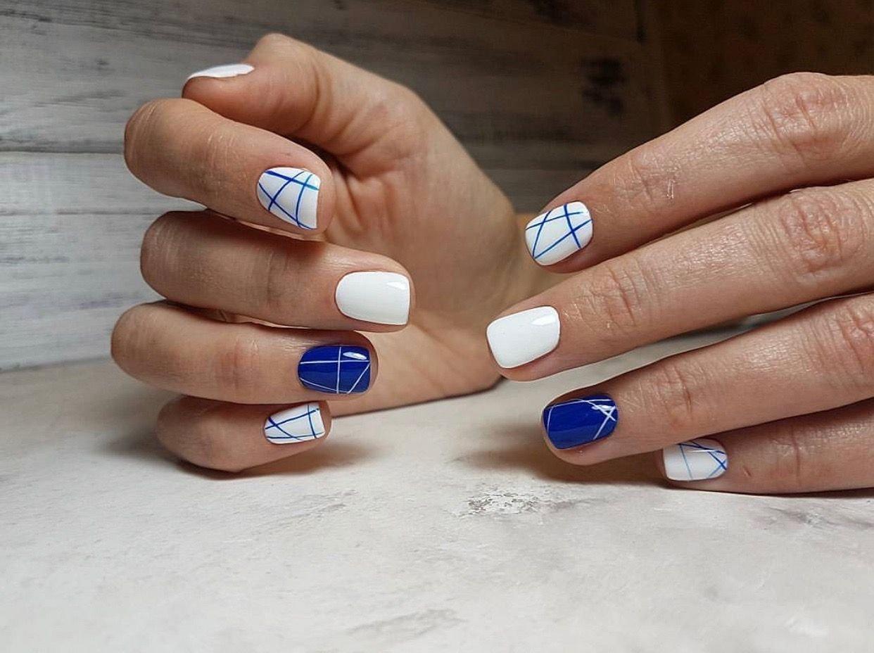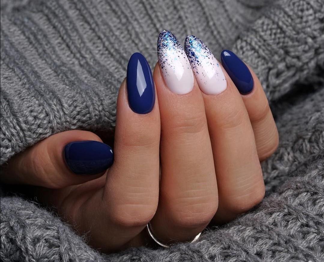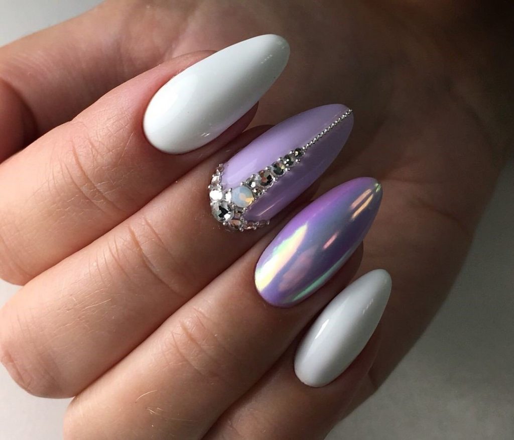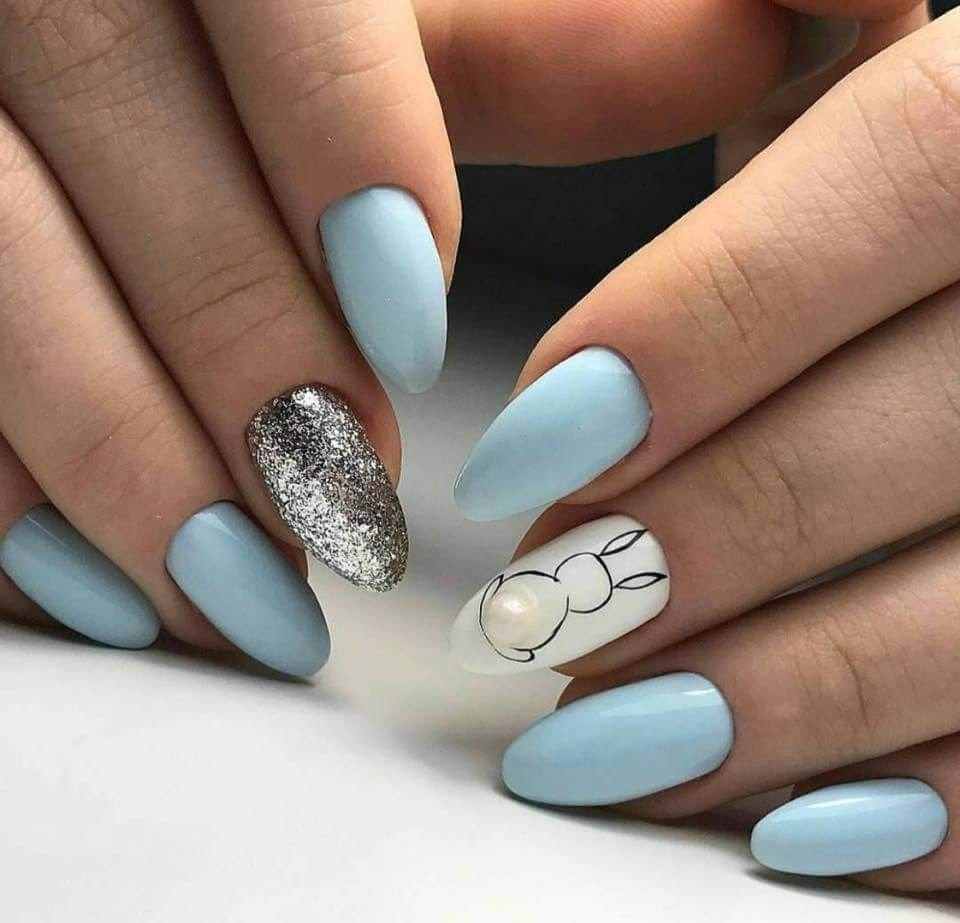Свежее, холодное, но при этом мягкое сочетание оттенков получите, если выберите сочетание с синим оттенком. Идеально для длинных ногтей, но может не менее эффектно смотреться и на коротких ноготочках. По желанию добавьте немного страз или глиттера.