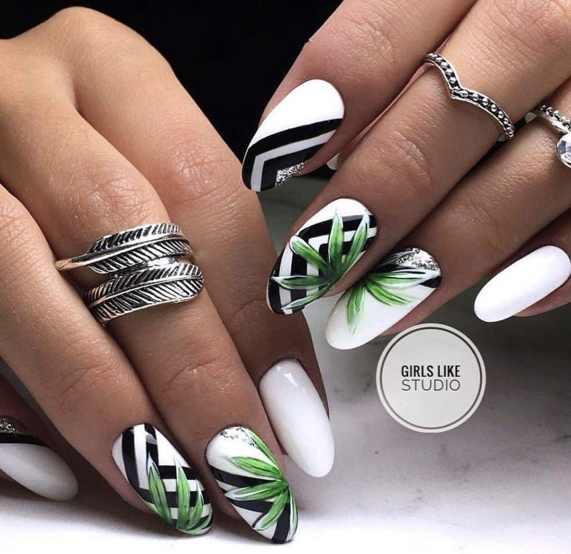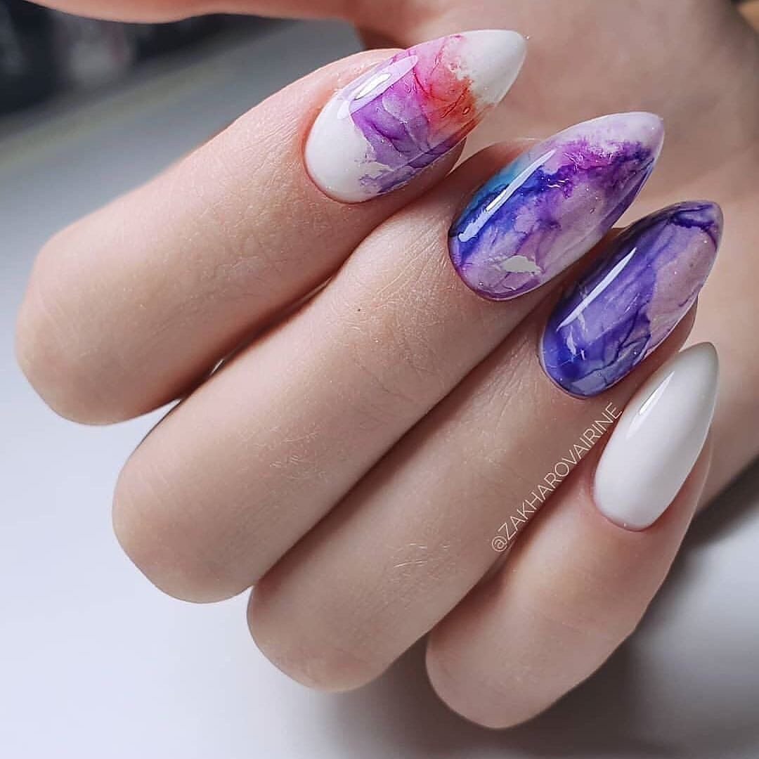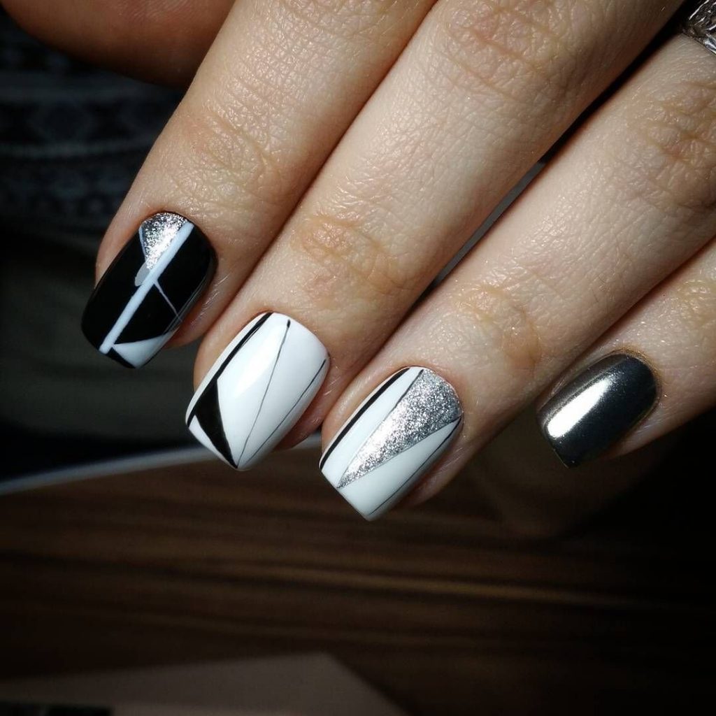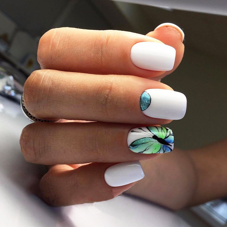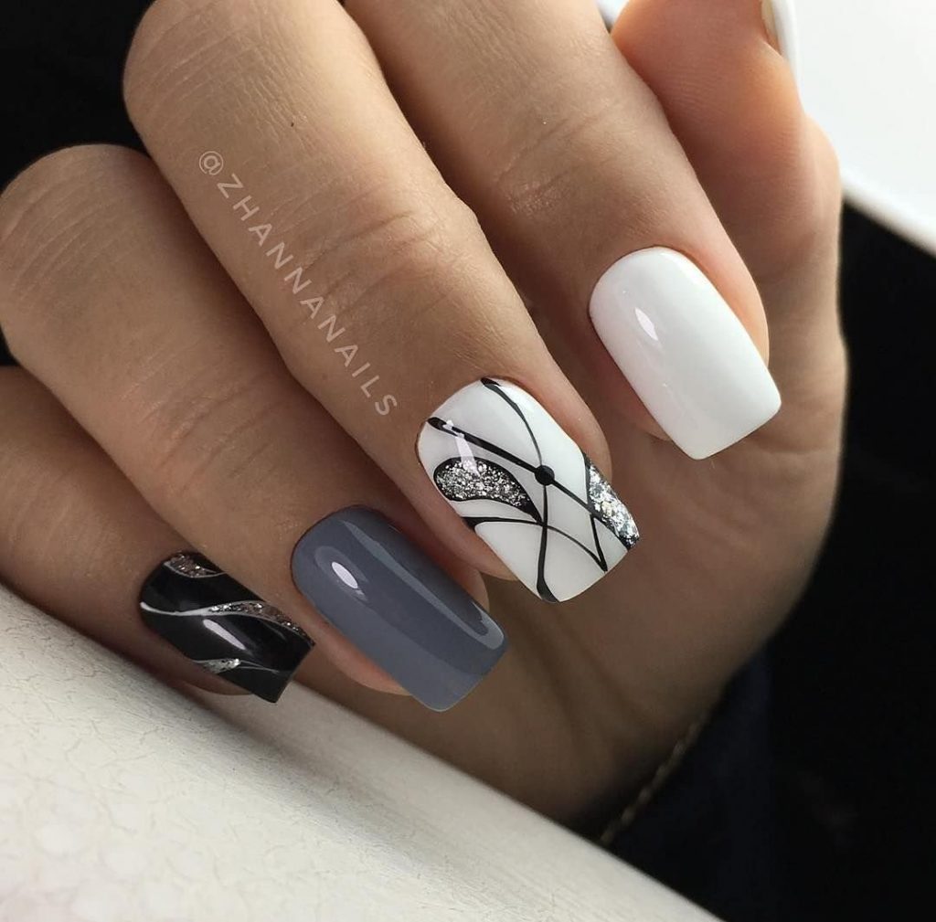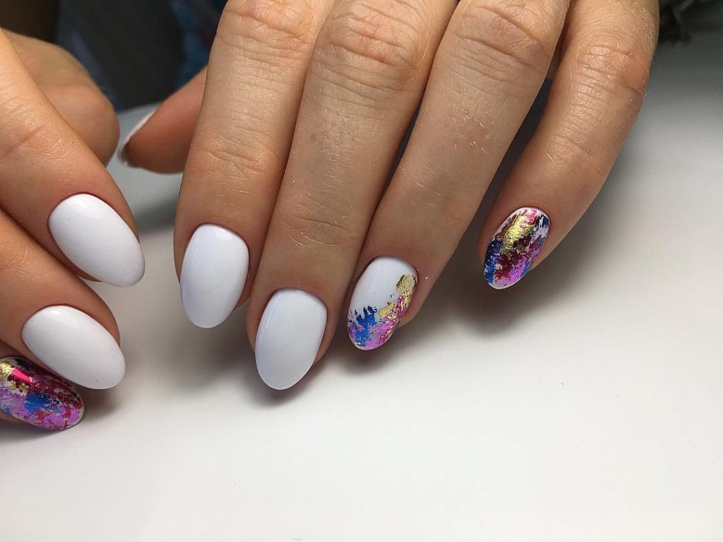 В тренде разноцветный маникюр, когда отдельные пальцы окрашивают белым лаком, а остальные — другими цветами. Дополняют композицию декором, росписью. Вариантов подобного маникюра множество, все зависит от концепции дизайна.