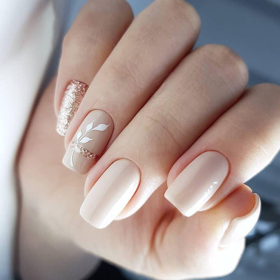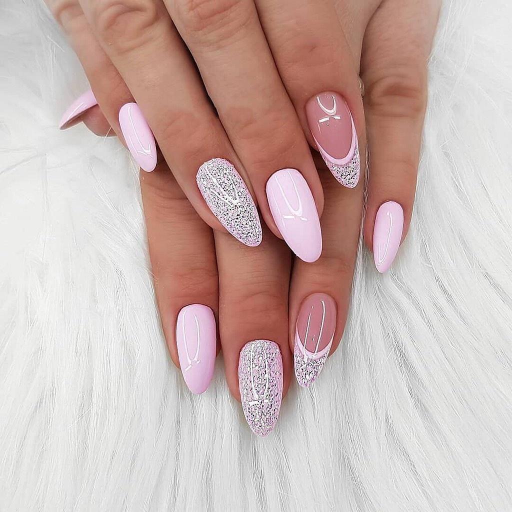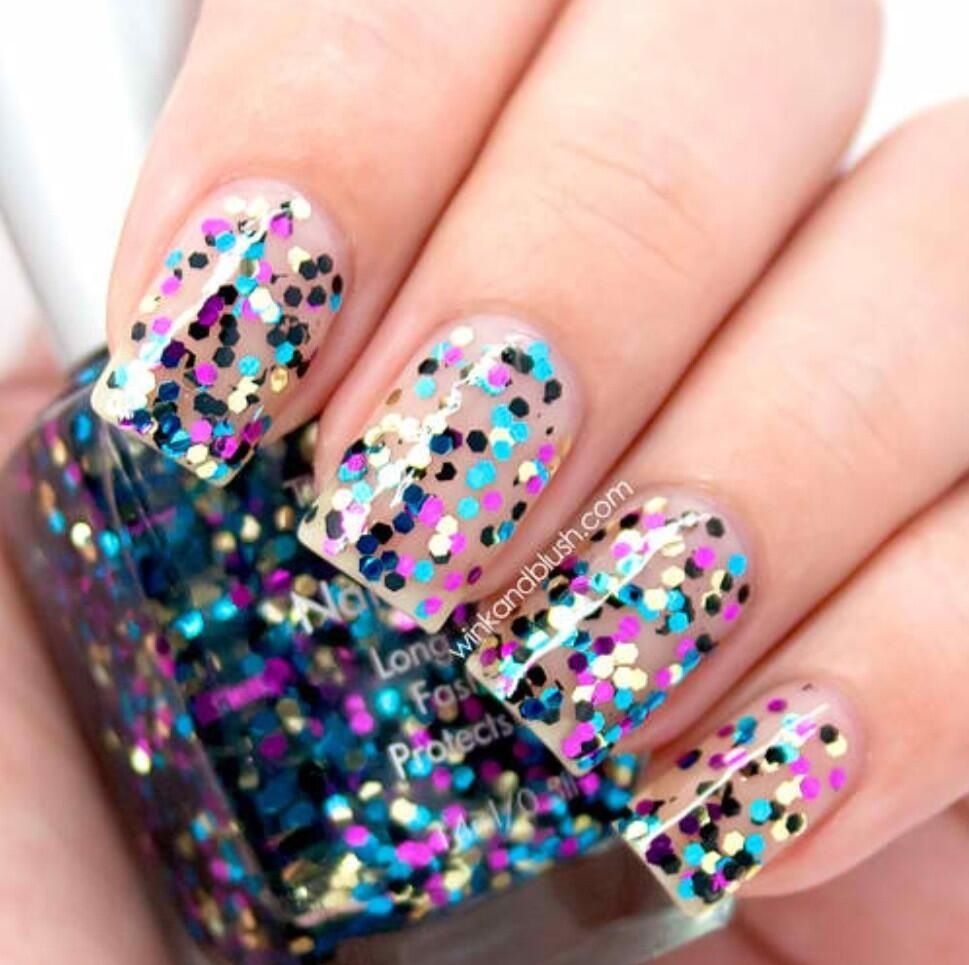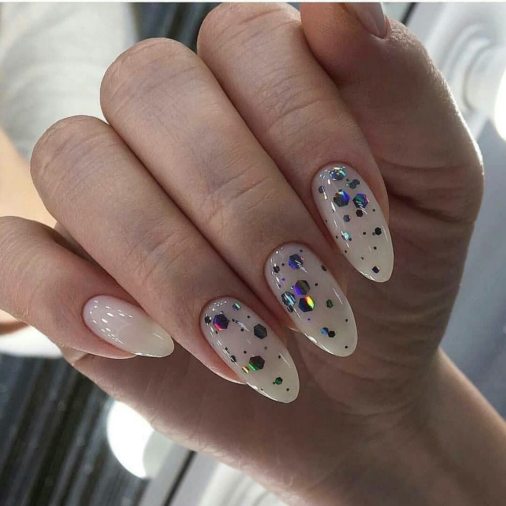 Применение глиттера поможет сделать женственный и легкий рисунок. Выглядит нежно, женственно, но при этом модно.