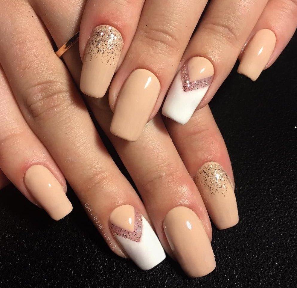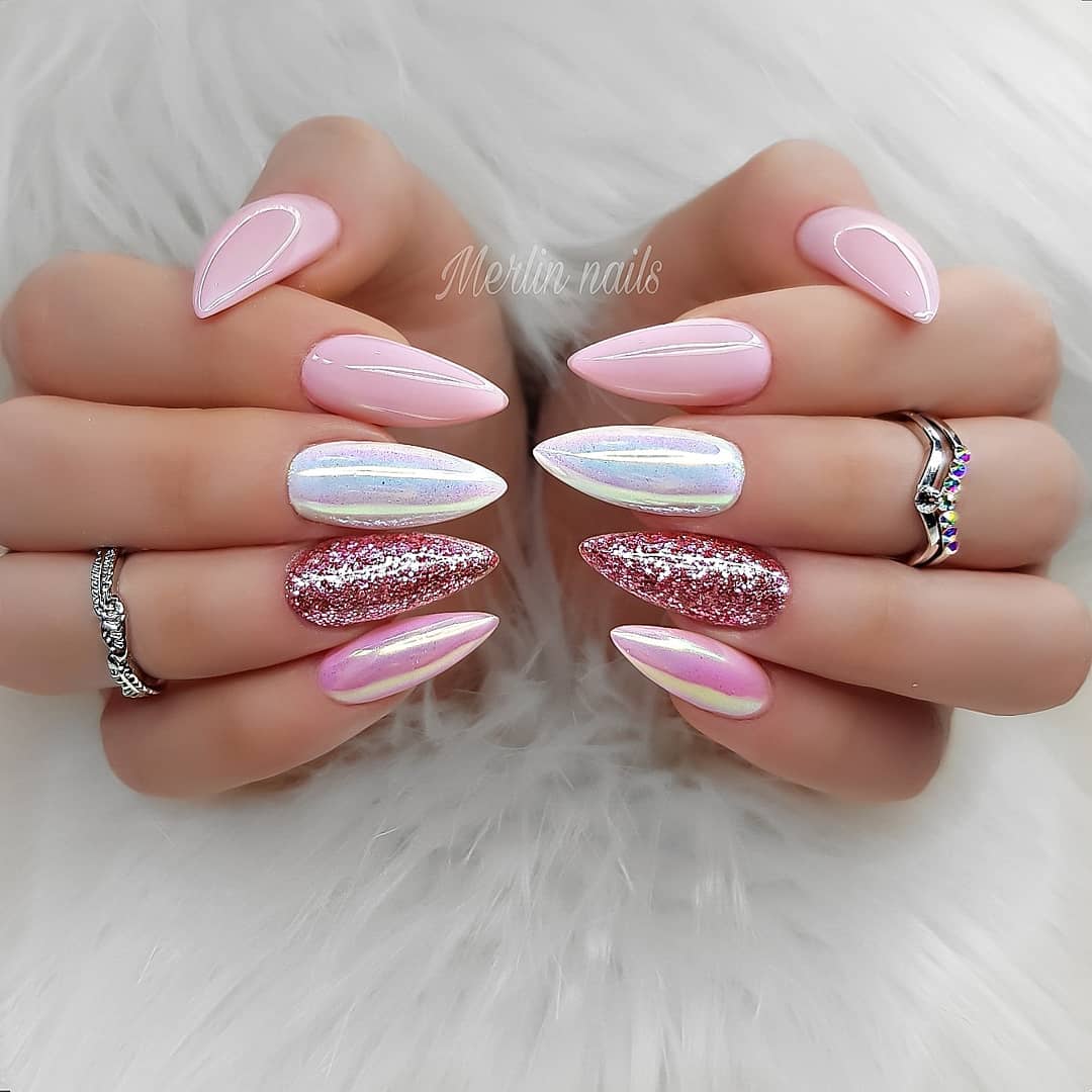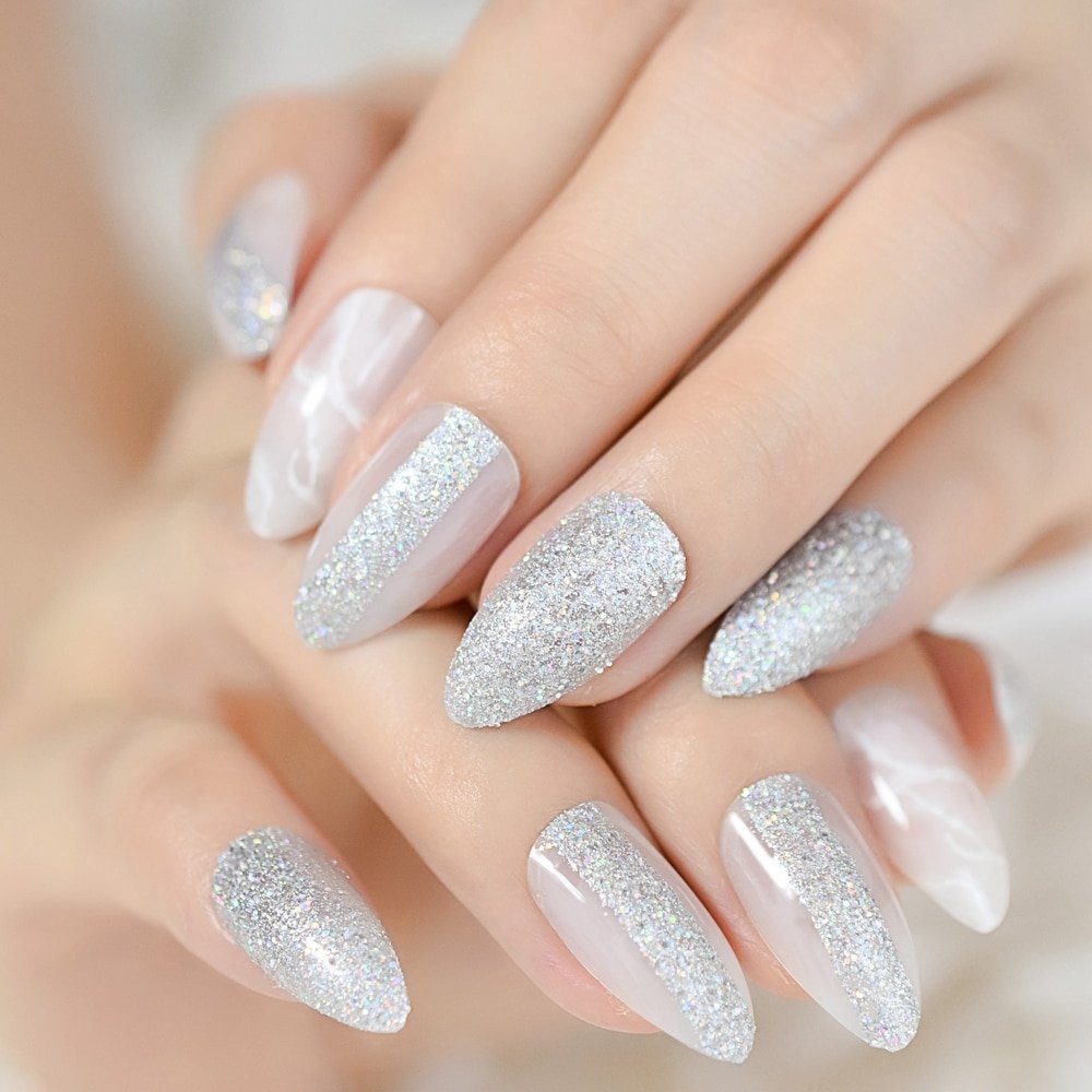 Применение глиттера поможет сделать женственный и легкий рисунок. Выглядит нежно, женственно, но при этом модно.