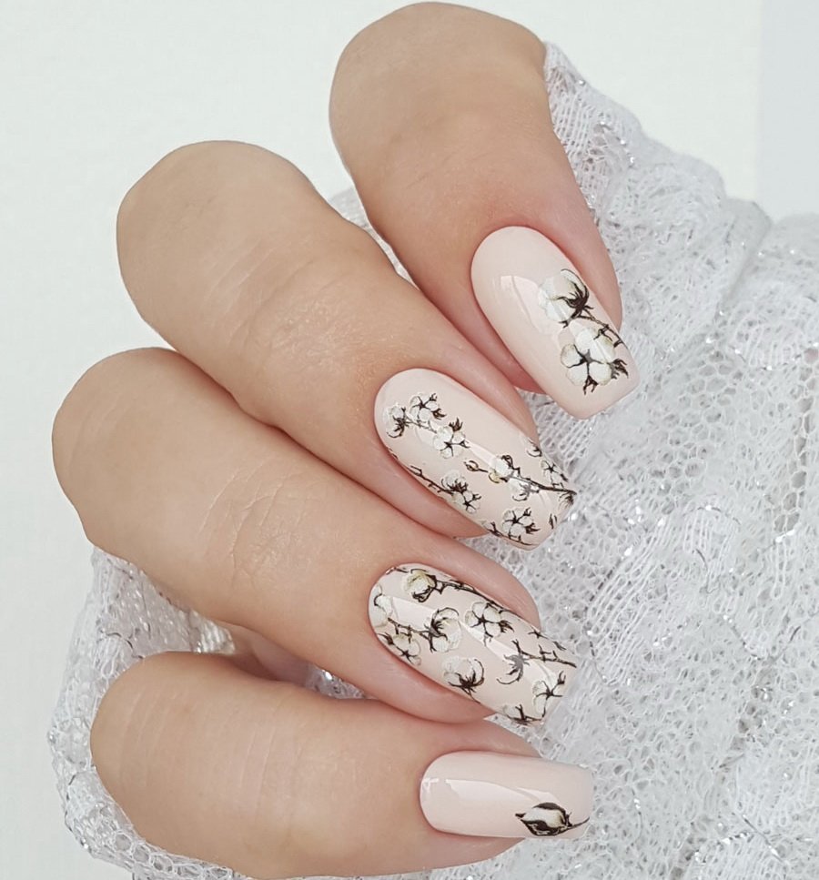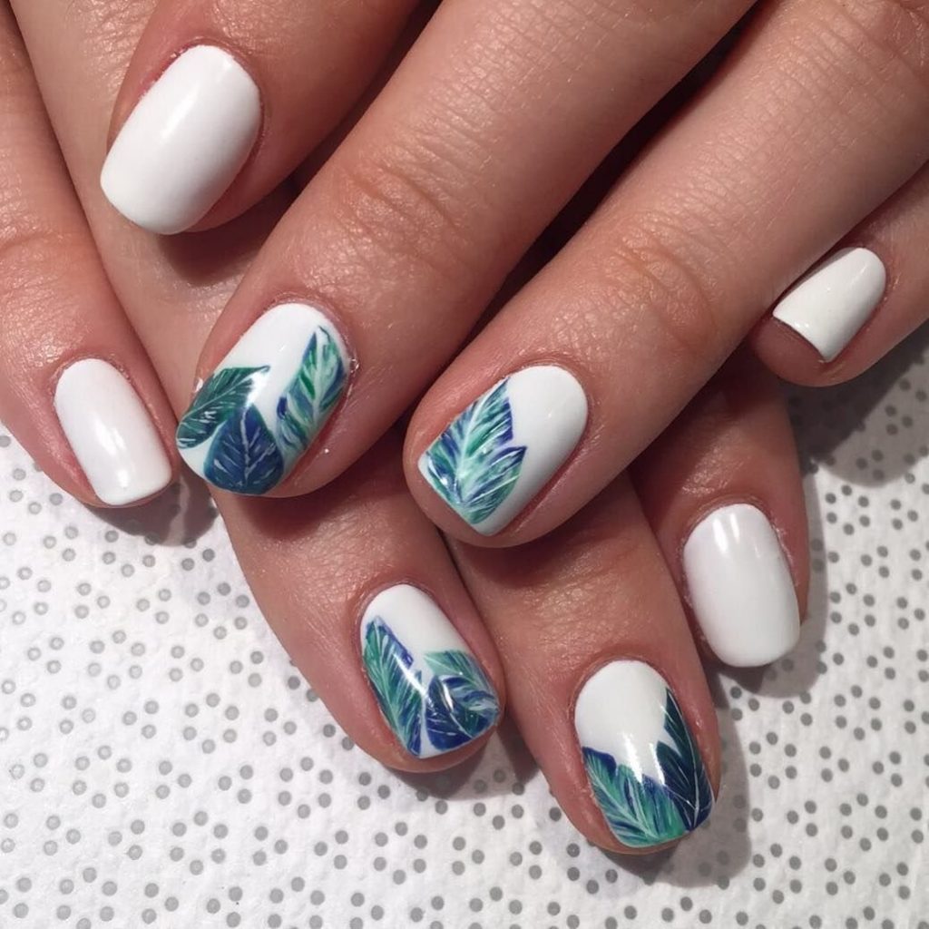 Наклейки можно нанести на ногтевую пластину и дома. Надо только смочить выбранный образец в чуть теплой воде, отделить принт от основы и наложить на ноготь с белой базой. Покрыть топом.