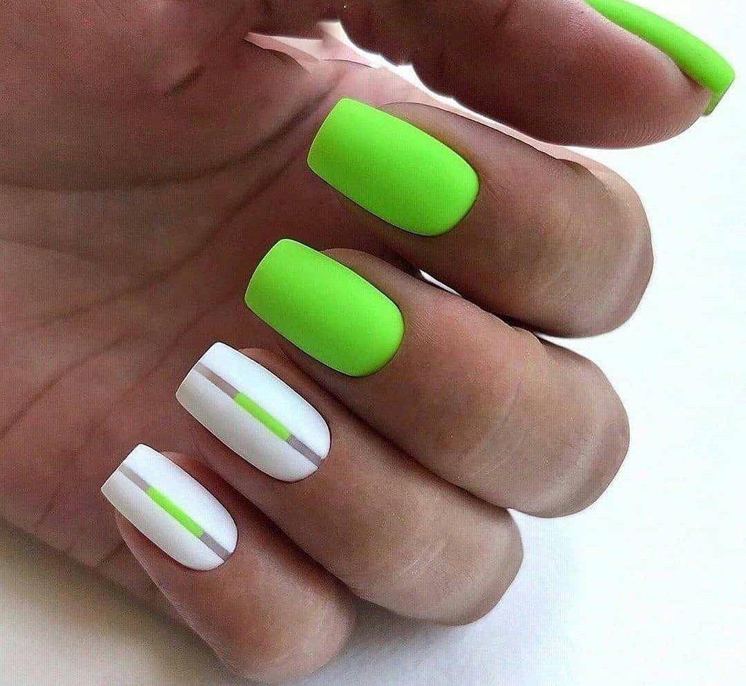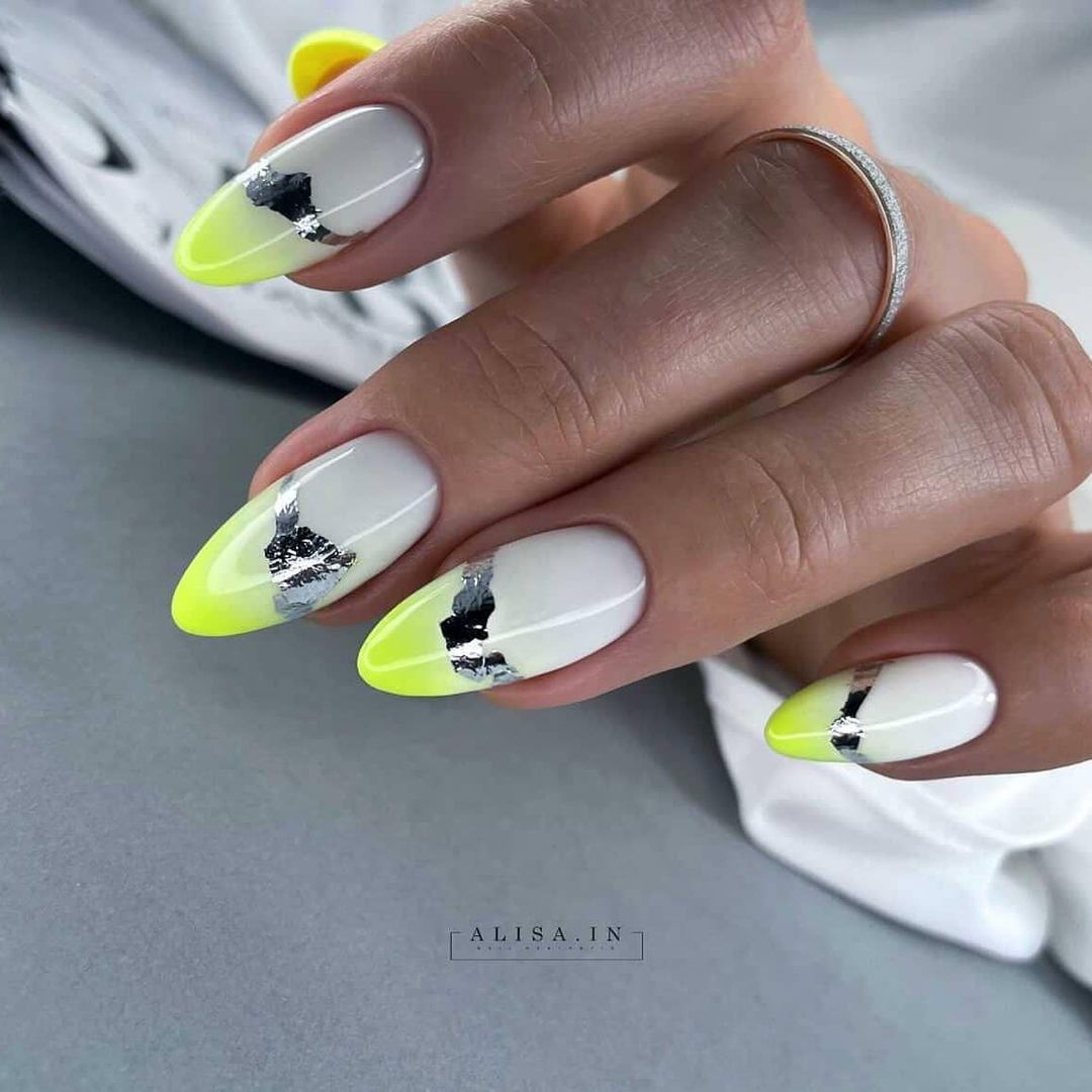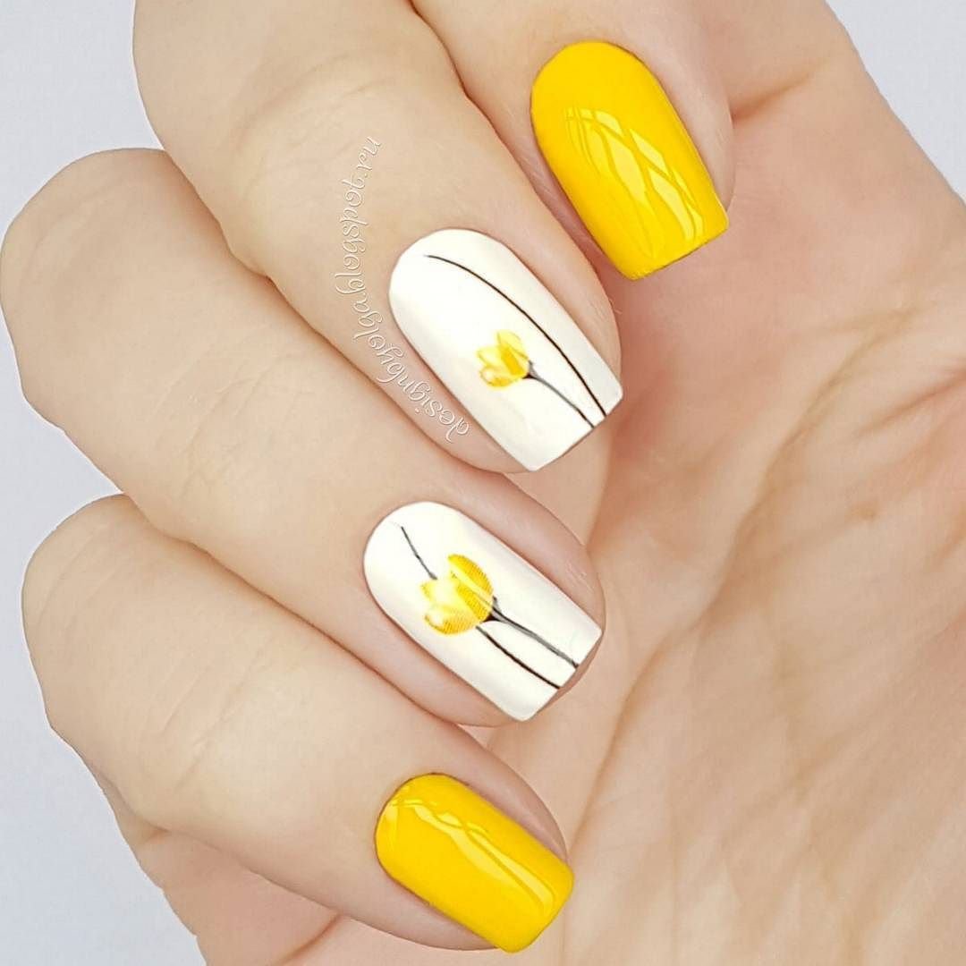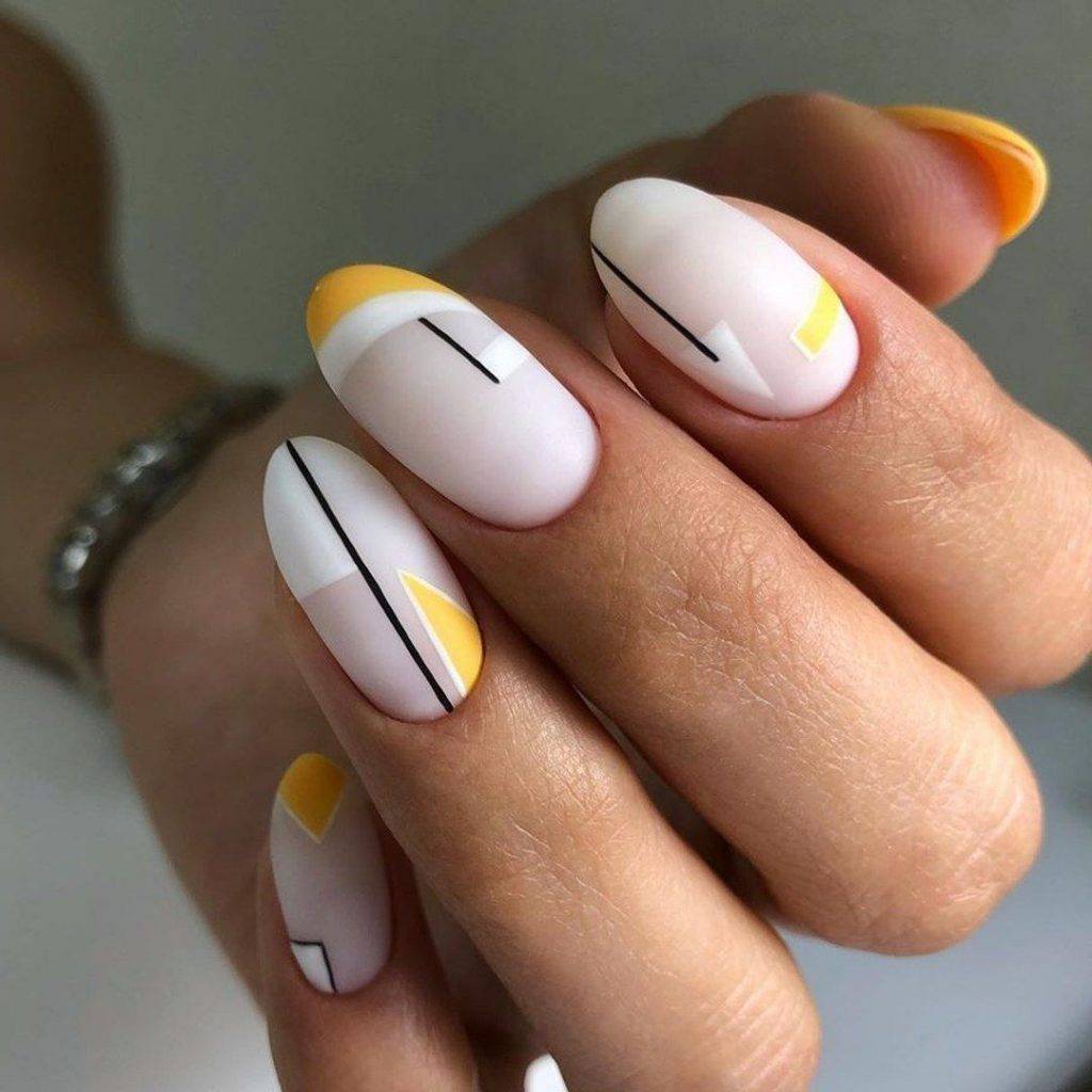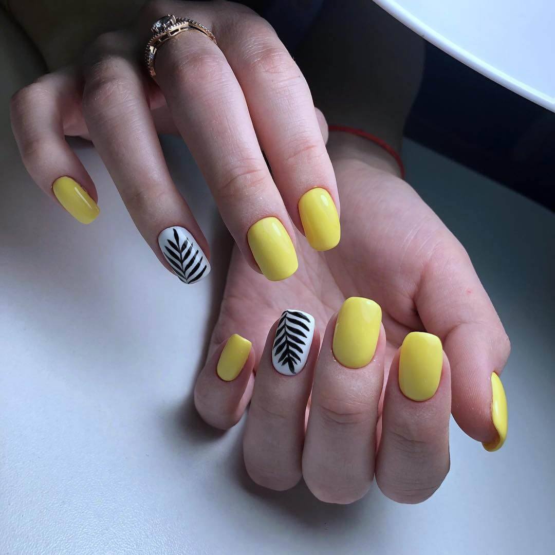 Комбо с желтым — шикарное, позитивное и яркое решение для лета. Одинаково хорошо смотрится на коротких и длинных ноготочках. В качестве декора можно выбрать цветы, геометрию, абстракции и все, что пожелаете.