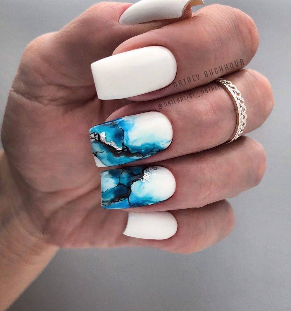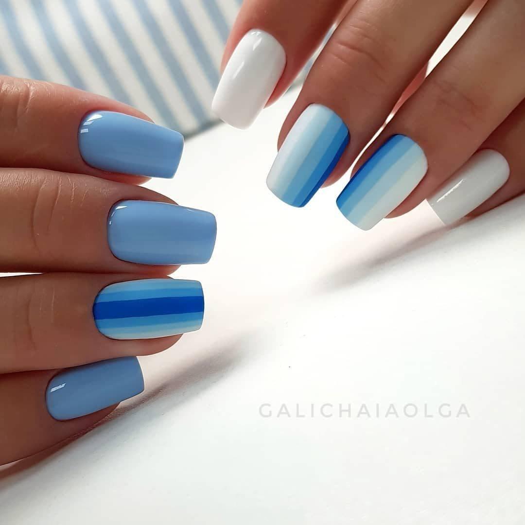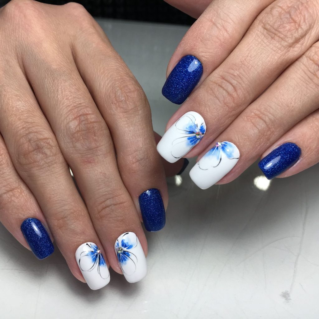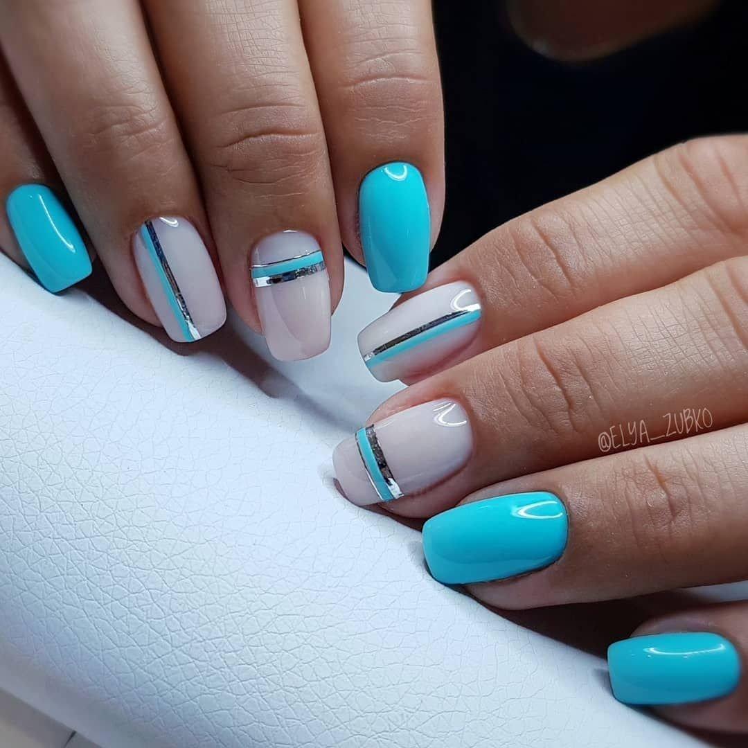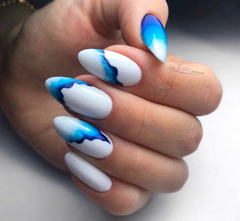 Также в 2020 году пользуются популярностью и яркие решения. К примеру, синий цвет достаточно часто используют для градиентного маникюра. Его сочетание с белым цветом – идеальная база для цветочного или геометрического дизайна