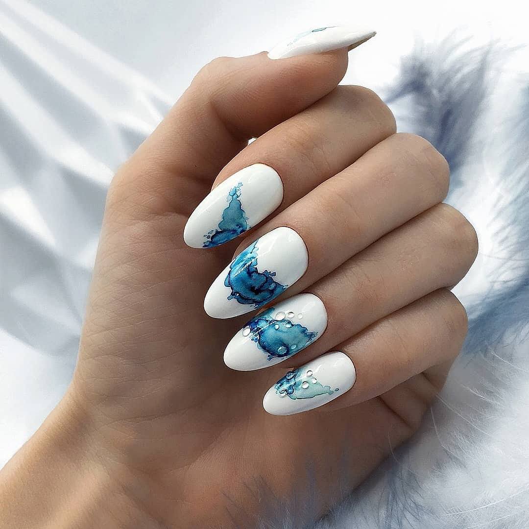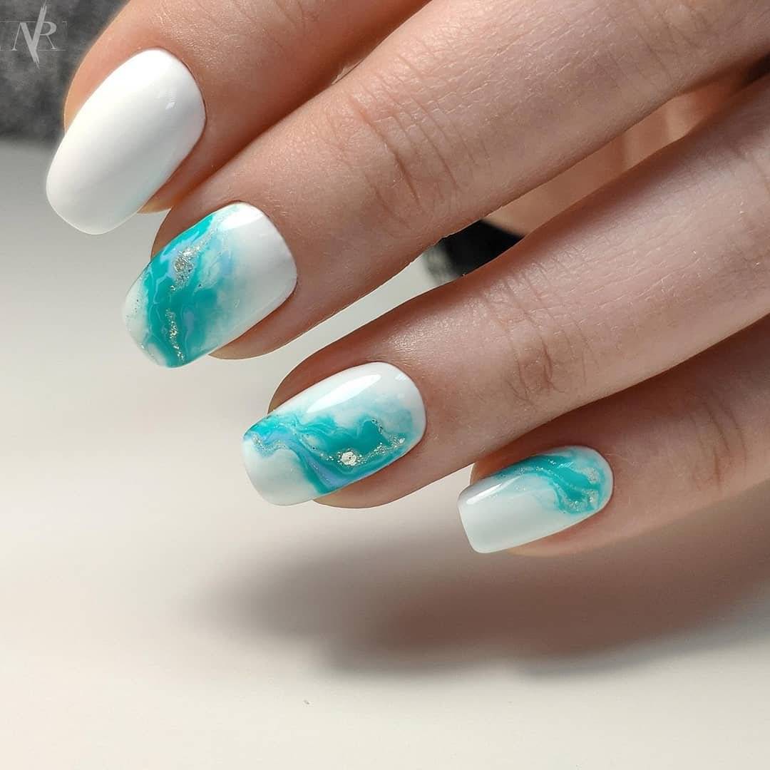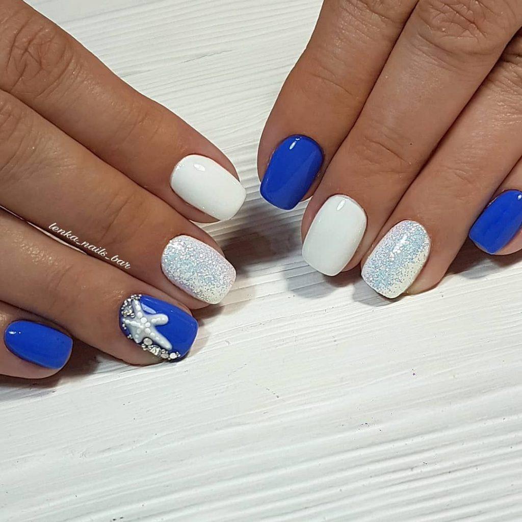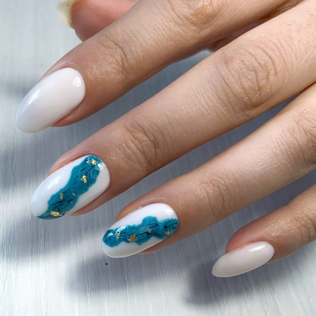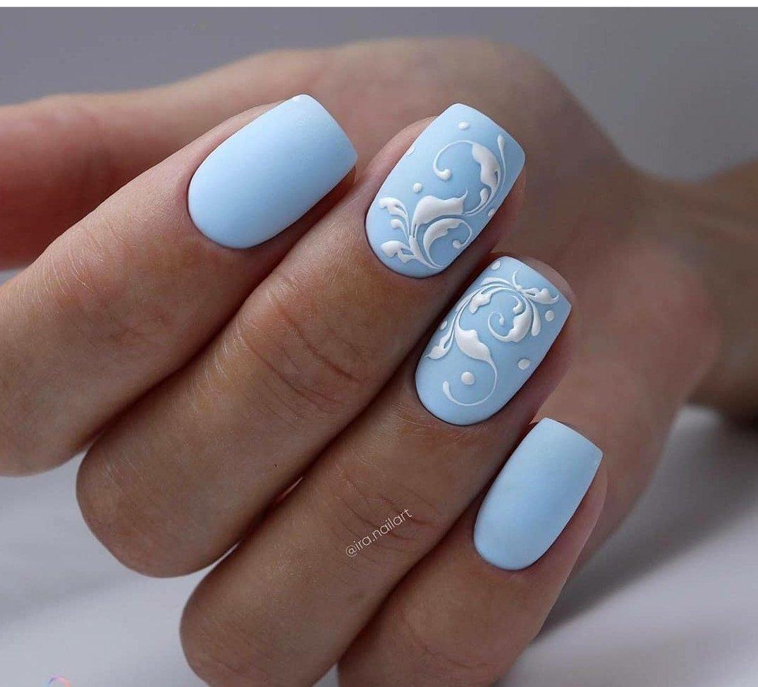 Также в 2020 году пользуются популярностью и яркие решения. К примеру, синий цвет достаточно часто используют для градиентного маникюра. Его сочетание с белым цветом – идеальная база для цветочного или геометрического дизайна