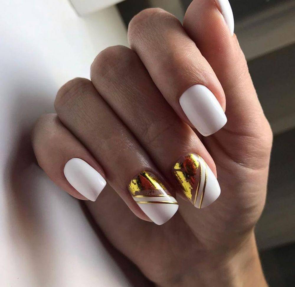 На страницах журналов с фото белого маникюра для 2022 году просматривается модная тенденция — обилие декора из фольги. Существует много видов фольгированного материала для нейл-арта. При помощи трафаретной фольги создают блестящие узоры на белом фоне. Используя другие виды, накладывают разные абстрактные принты с матовыми и глянцевыми текстурами.