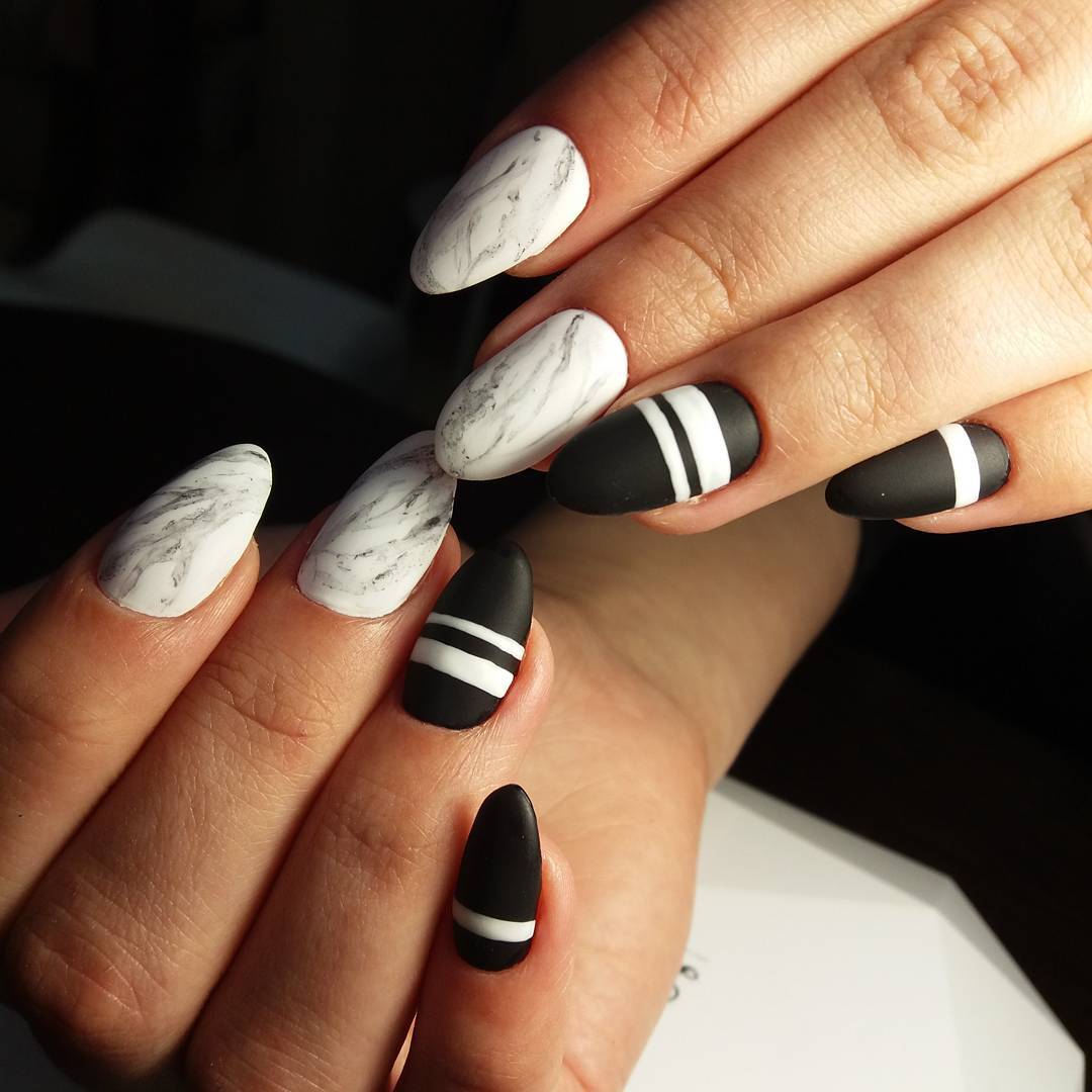 Матовая основа уже давно в тренде. Часто кажется более роскошной версией нюдового варианта. Не лишним будет попробовать использовать другие оттенки в светлой базе для матовой основы с орнаментом. Часто актуален черно-белый матовый дизайн. Или матовое покрытие с черным орнаментом.
