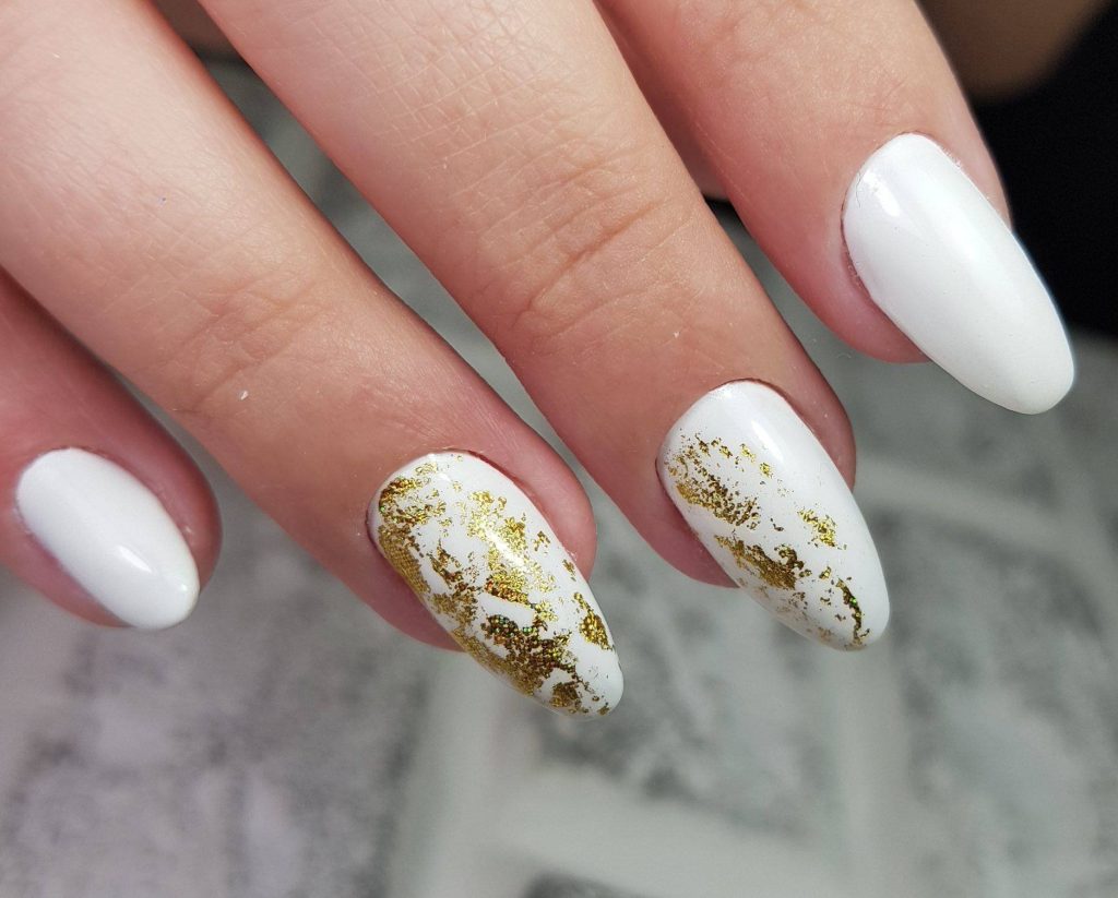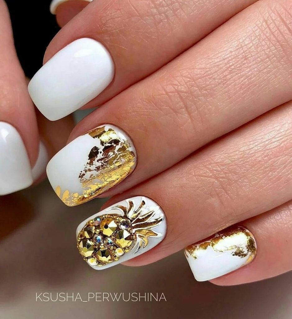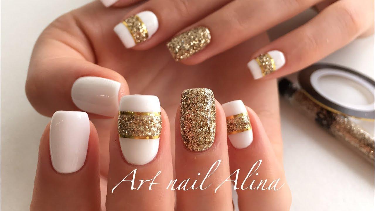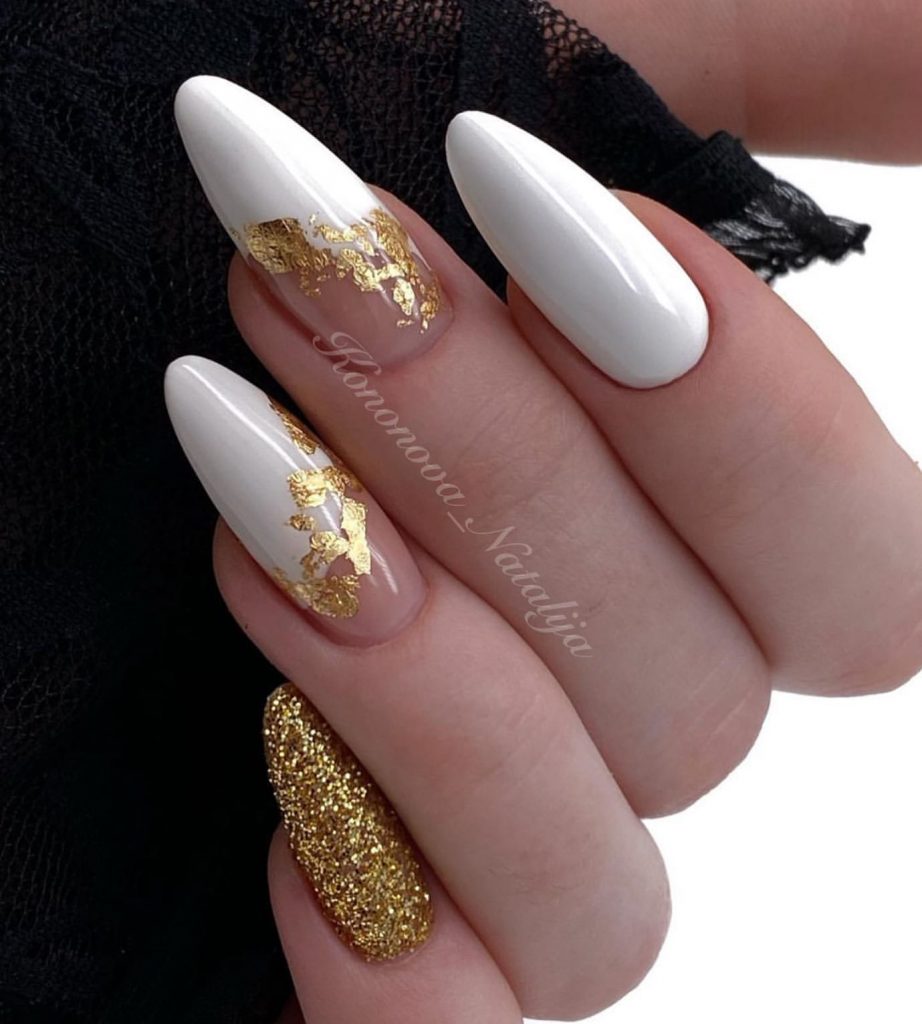 Белизна и золото — это выигрышное и роскошное сочетание красок. В качестве третьего оттенка добавьте черный, синий или красный. Для декора используют фольгу, блестки, ремешки со стразами.