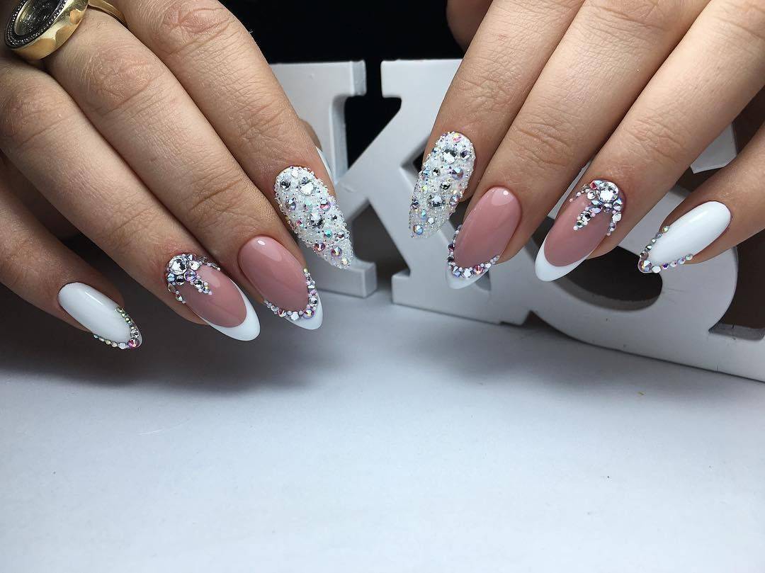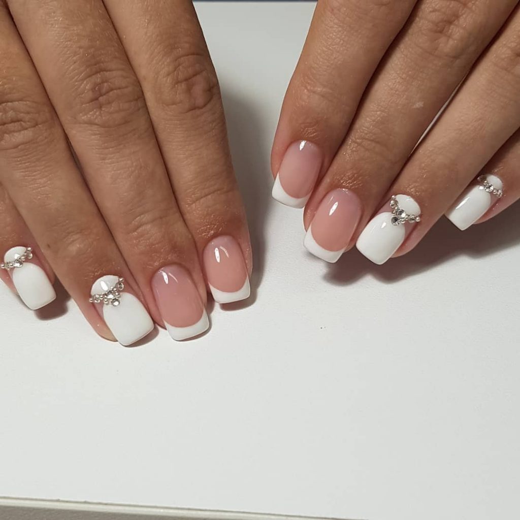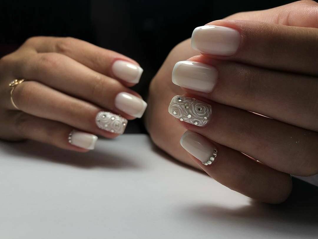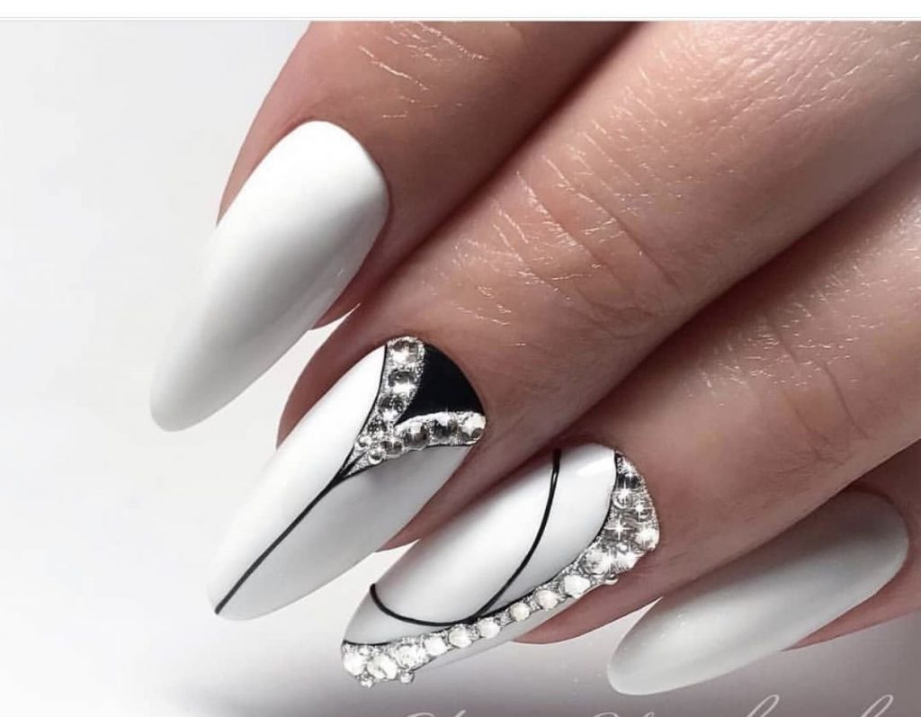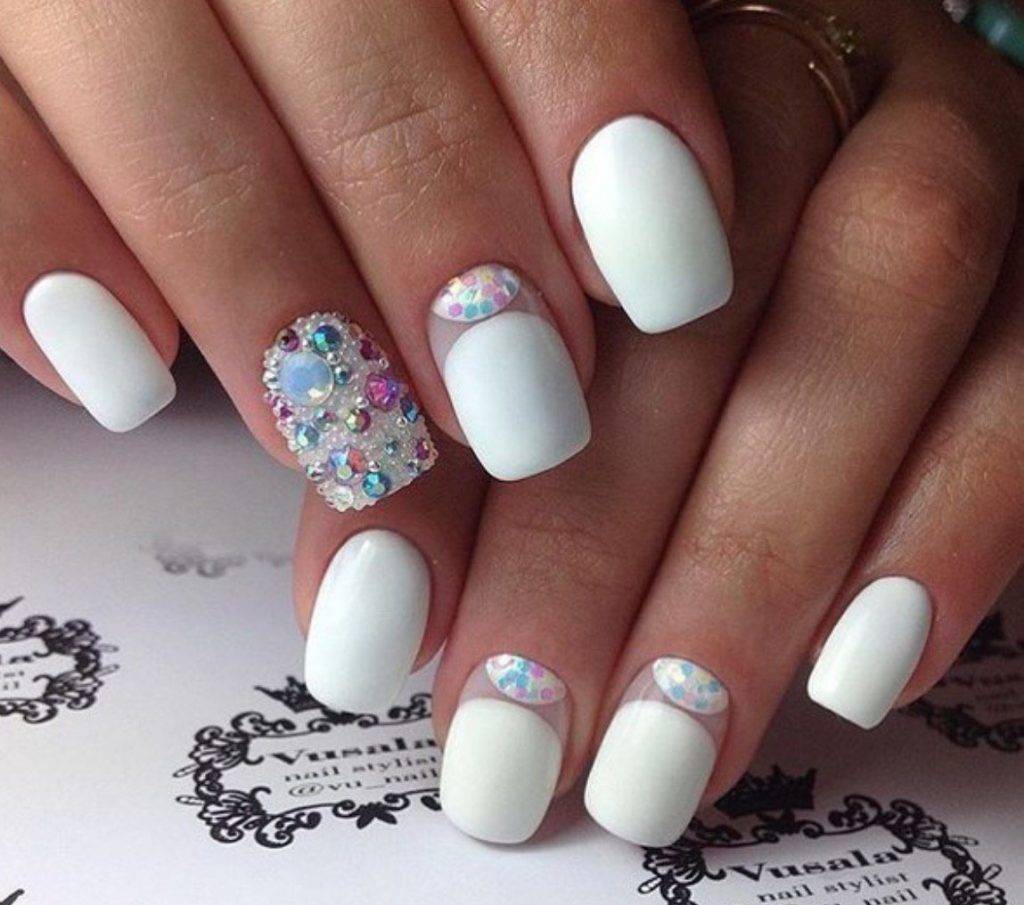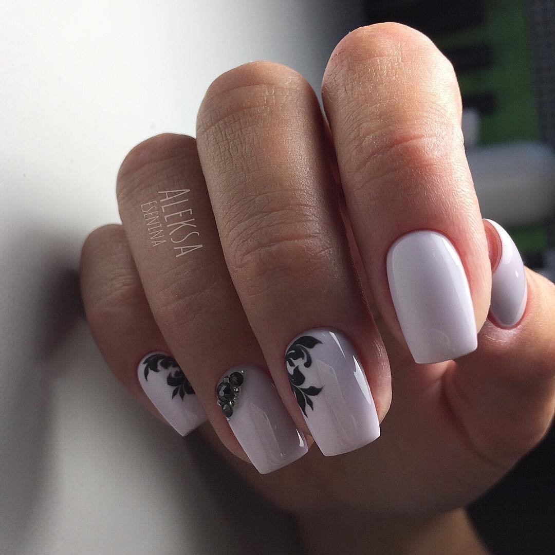 Белые ногти 2022-2023 с дизайном: варианты рисунков, декора со стразами