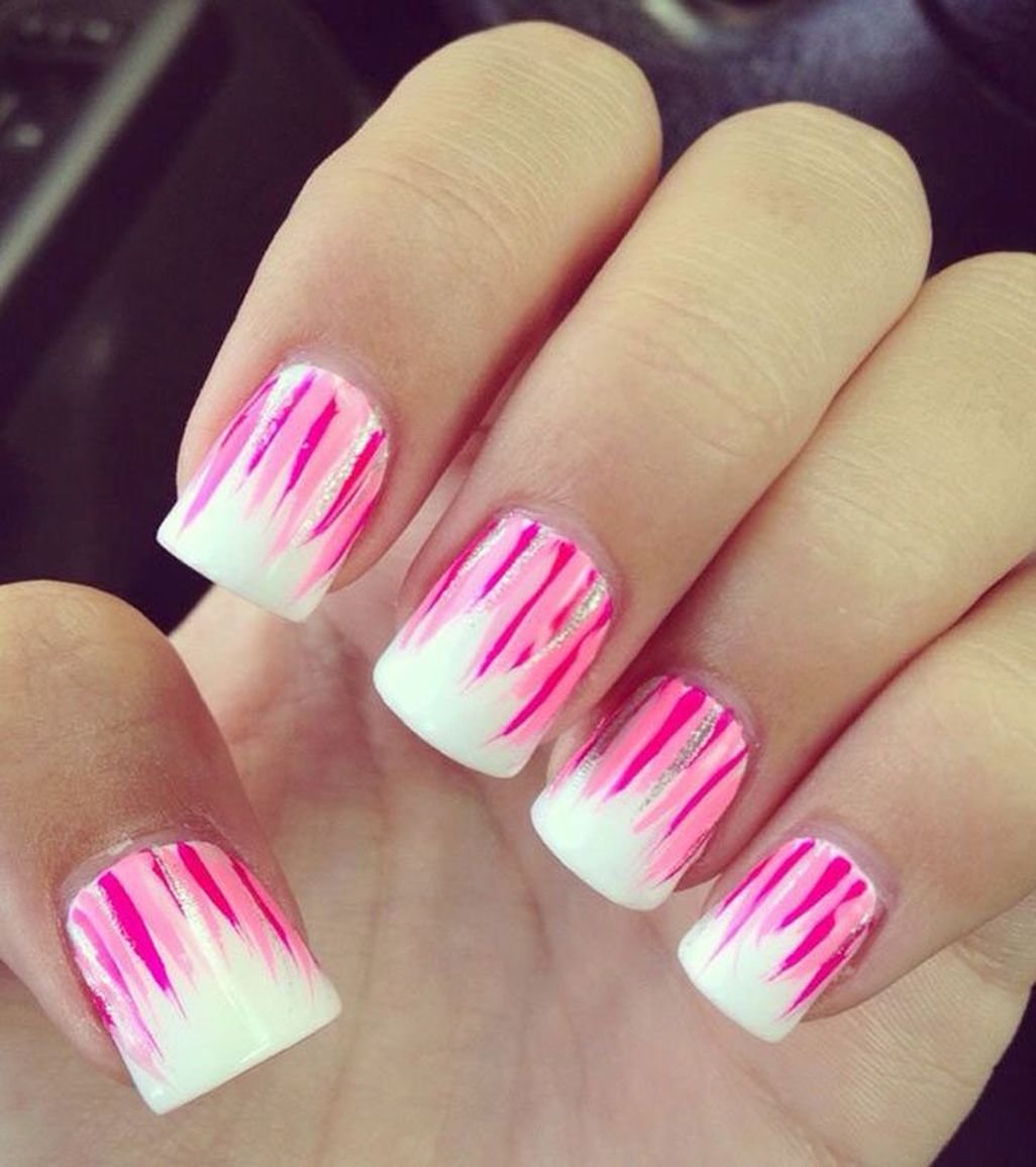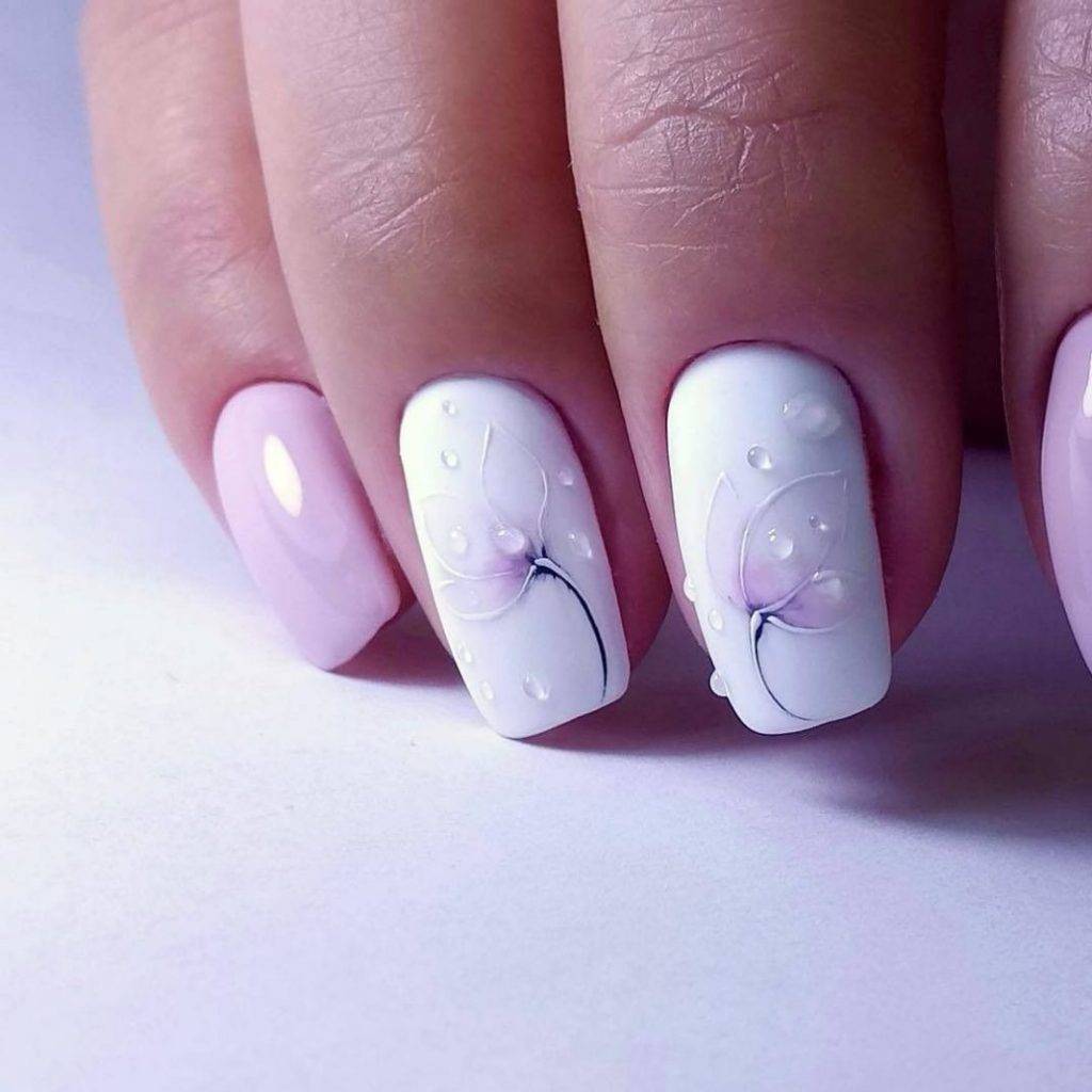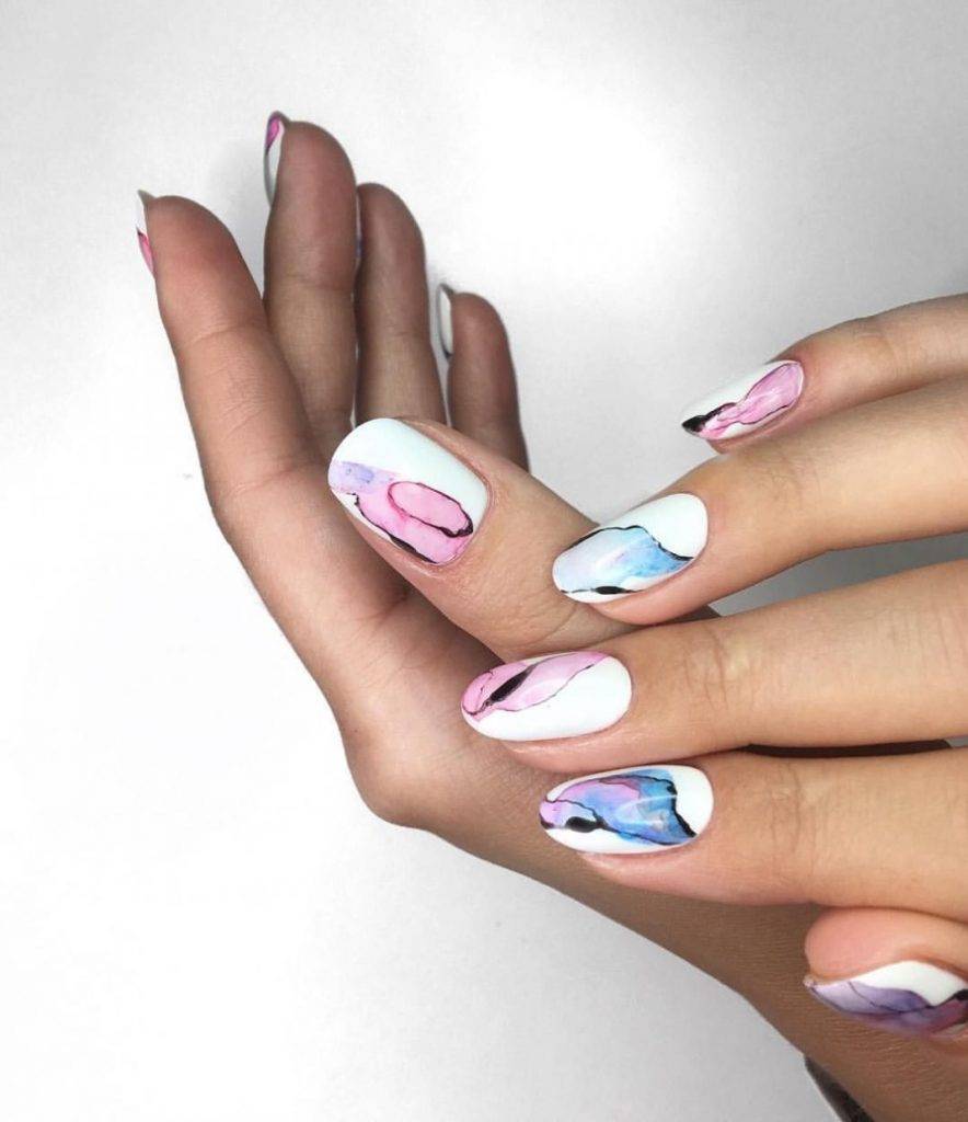 Любительницам нежного маникюра стоит присмотреться к розовому цвету. Вместе с белым лаком он выглядит более мягко, сдержанно, романтично. Поэтому не удивительно, что в таком решении чаще всего делают маникюр с цветочным рисунком. В зависимости от насыщенности розового цвета он будет выглядеть немного по-разному. То же самое касается и других оттенков пастельной цветовой гаммы. Каждый из них невероятно красиво выглядит в сочетании с белым покрытием.