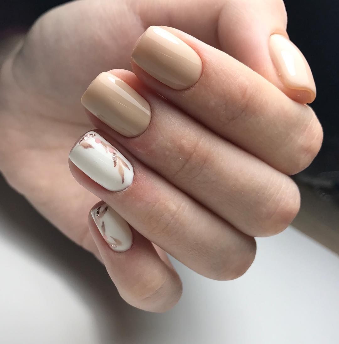 Нейтральное оформление все также актуально. К примеру, бежево-белое покрытие позволяет создать максимально неброский, ухоженный маникюр. Примечательно, что в таком цветовом решении можно сделать абсолютно любой дизайн, по собственному усмотрению. То же самое касается и других нежных оттенков, таких как персиковый, сиреневый и т.д.