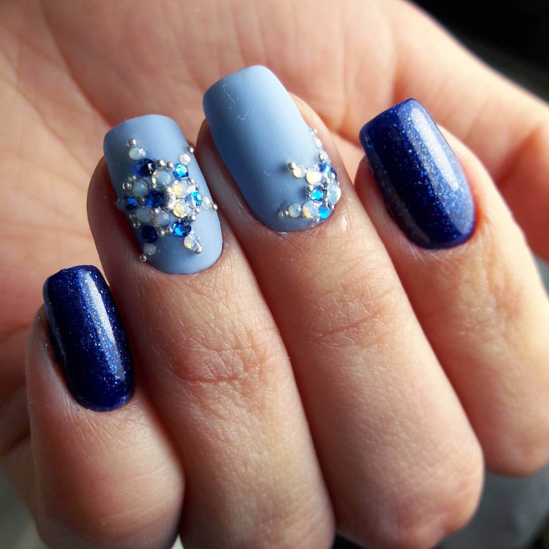 Очень красиво смотрится как классический однотонный синий маникюр, так и сочетание синего с белым цветом.