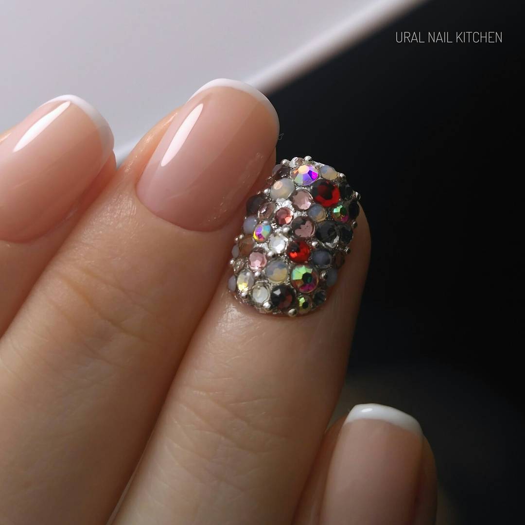 Классический лунный маникюр с ногтем, полностью покрытым стразами: