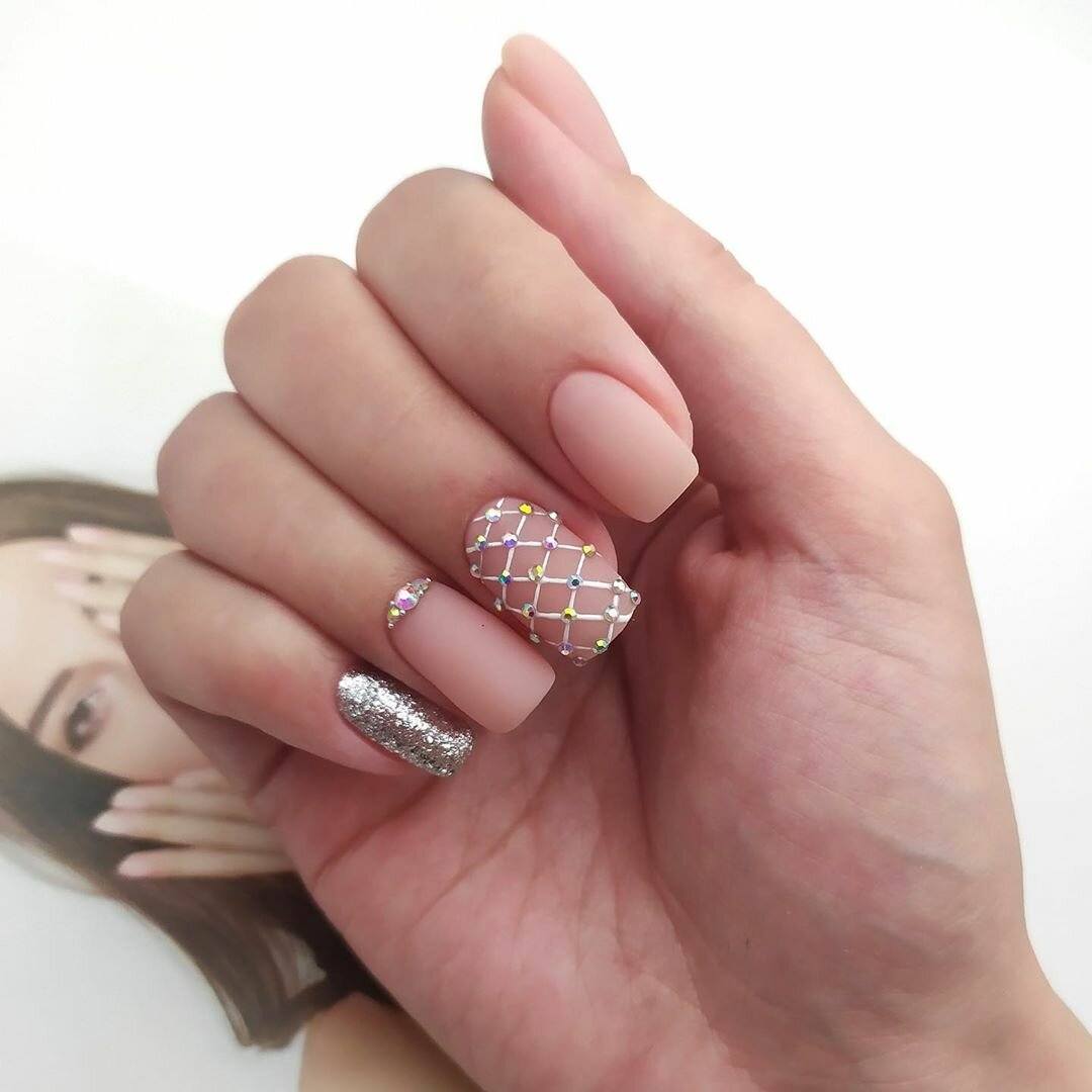 Матовый маникюр со стразами в бежевых тонах
