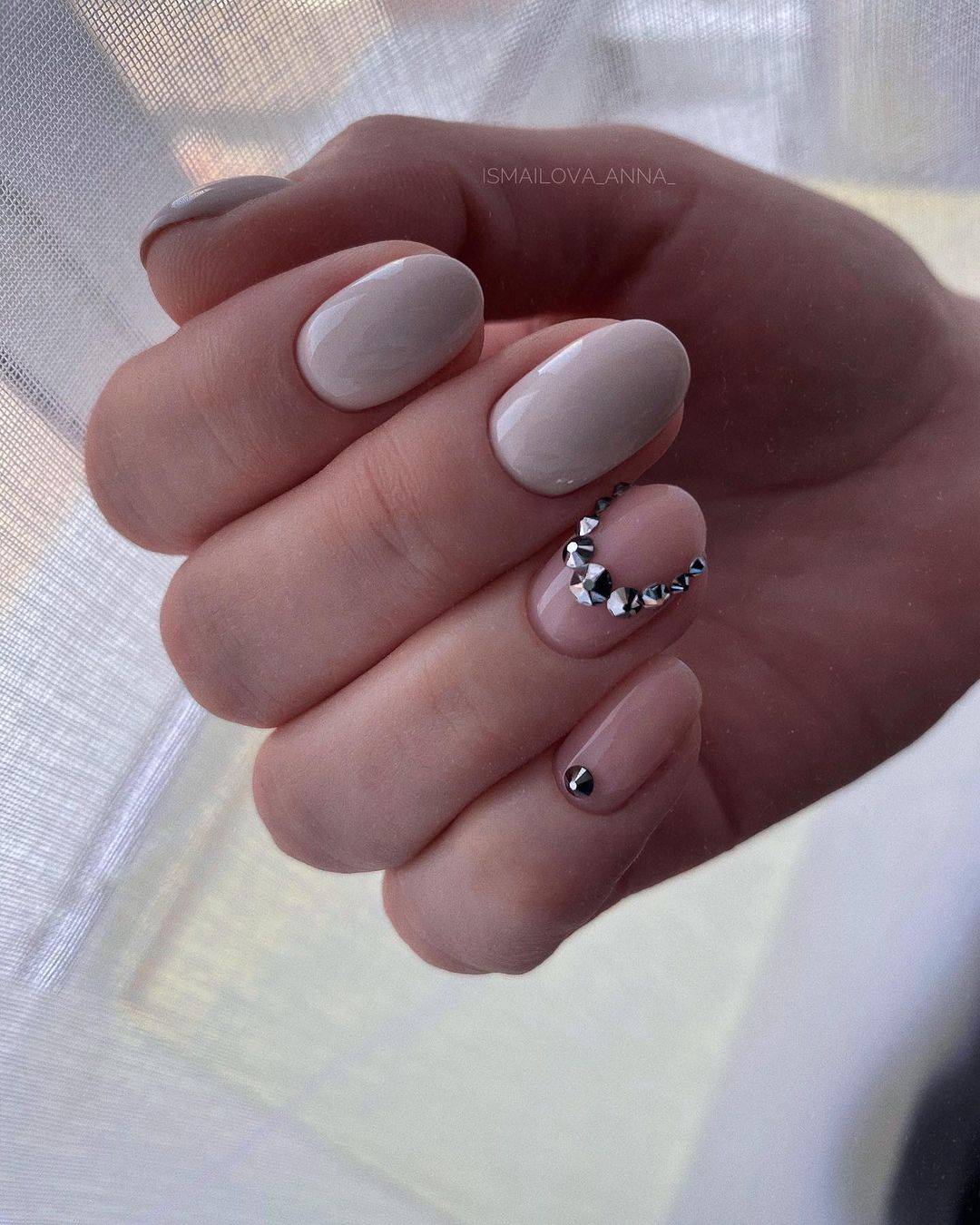 Итак, лидирующее место нашего списка самых красивых нюдовых нейлов бесспорно занимает однотонное оформлении, в котором стразы используются в качестве акцента на одном из ноготков. Не менее привлекательно смотрятся нюдовые ноготки с «драгоценной» россыпью или сверкающими камушками поверх рисунков