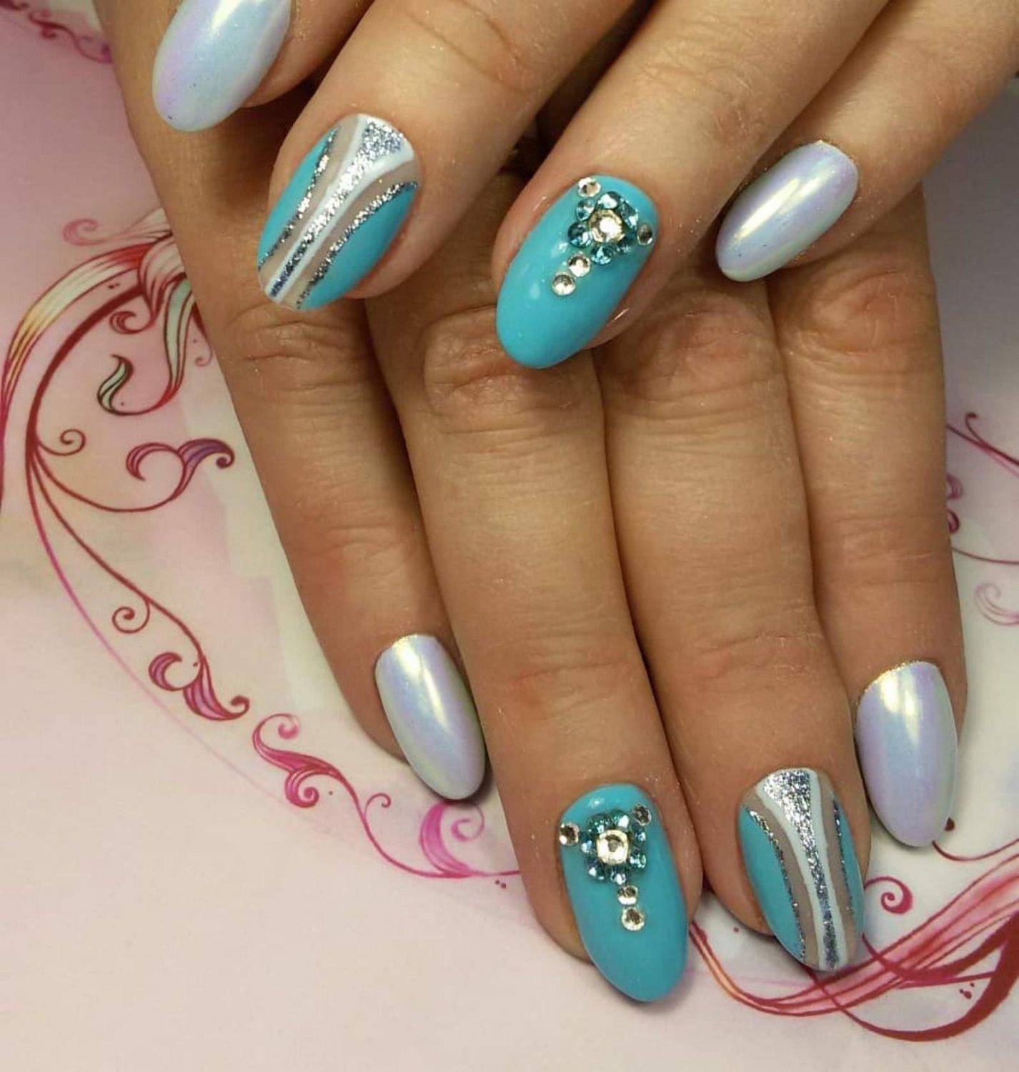 При выполнении бирюзового маникюра возможно использовать несколько техник дизайна в совокупности. Эксперименты могут длиться бесконечно.