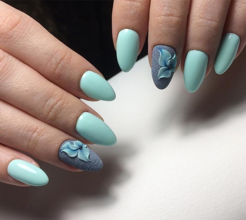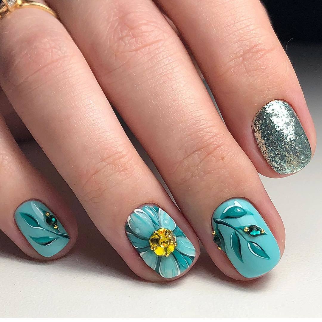 Нежный бирюзовый цвет ассоциируется с весенней прохладой и полевыми цветами, поэтому лучшим дополнением маникюра станет цветочный орнамент. Флористическая тема уже продолжительное время занимает лидирующие позиции среди всех способов украшения ноготков. Это неудивительно, ведь большое разнообразие цветов позволяет создать сотни уникальных, ярких и оригинальных нейл-артов.