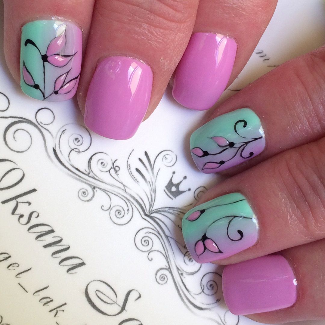 Плавные переходы необычных цветов делают ноготки более живыми и одновременно необычными. Прием омбре хорошо сочетается с цветами: