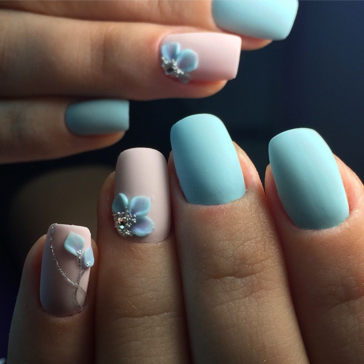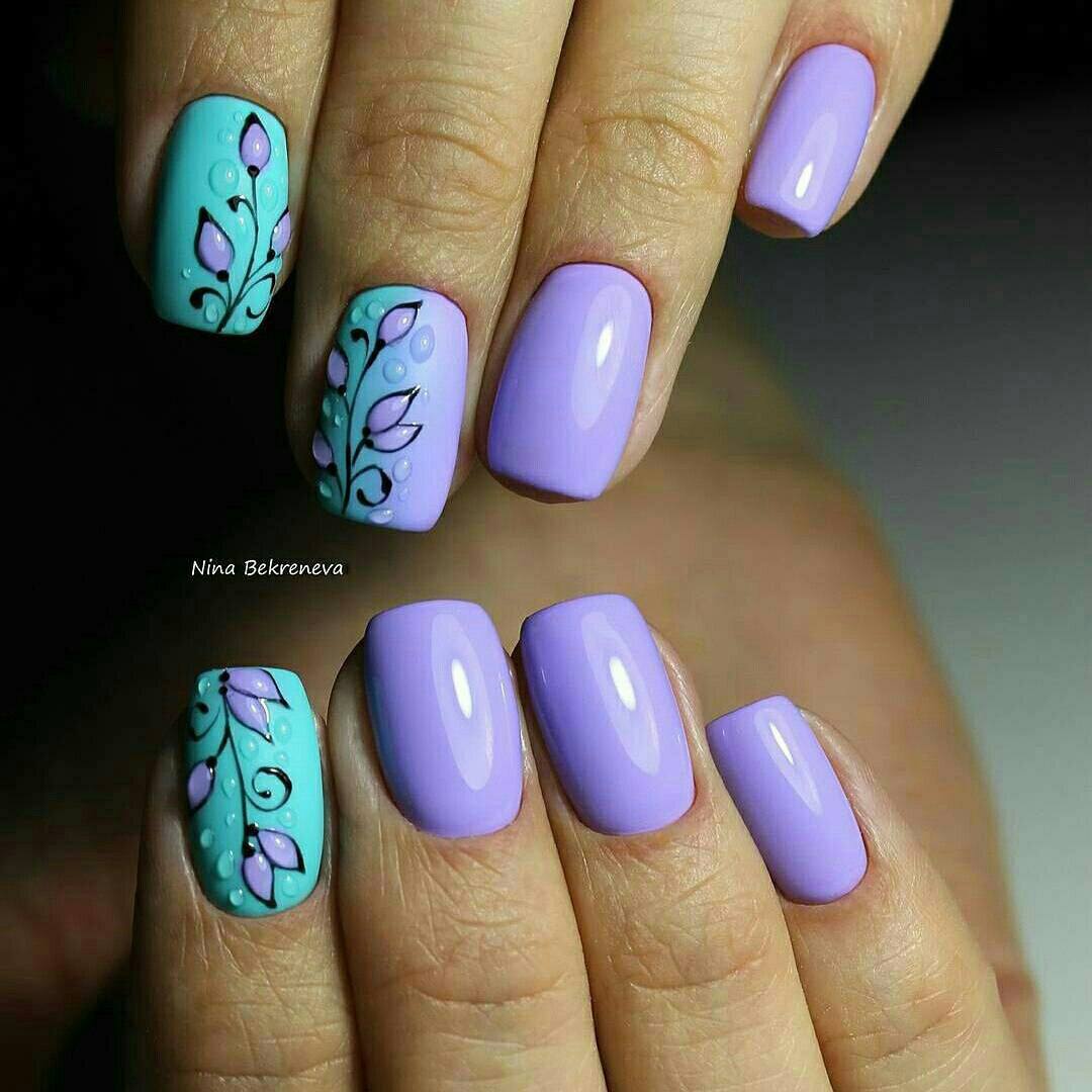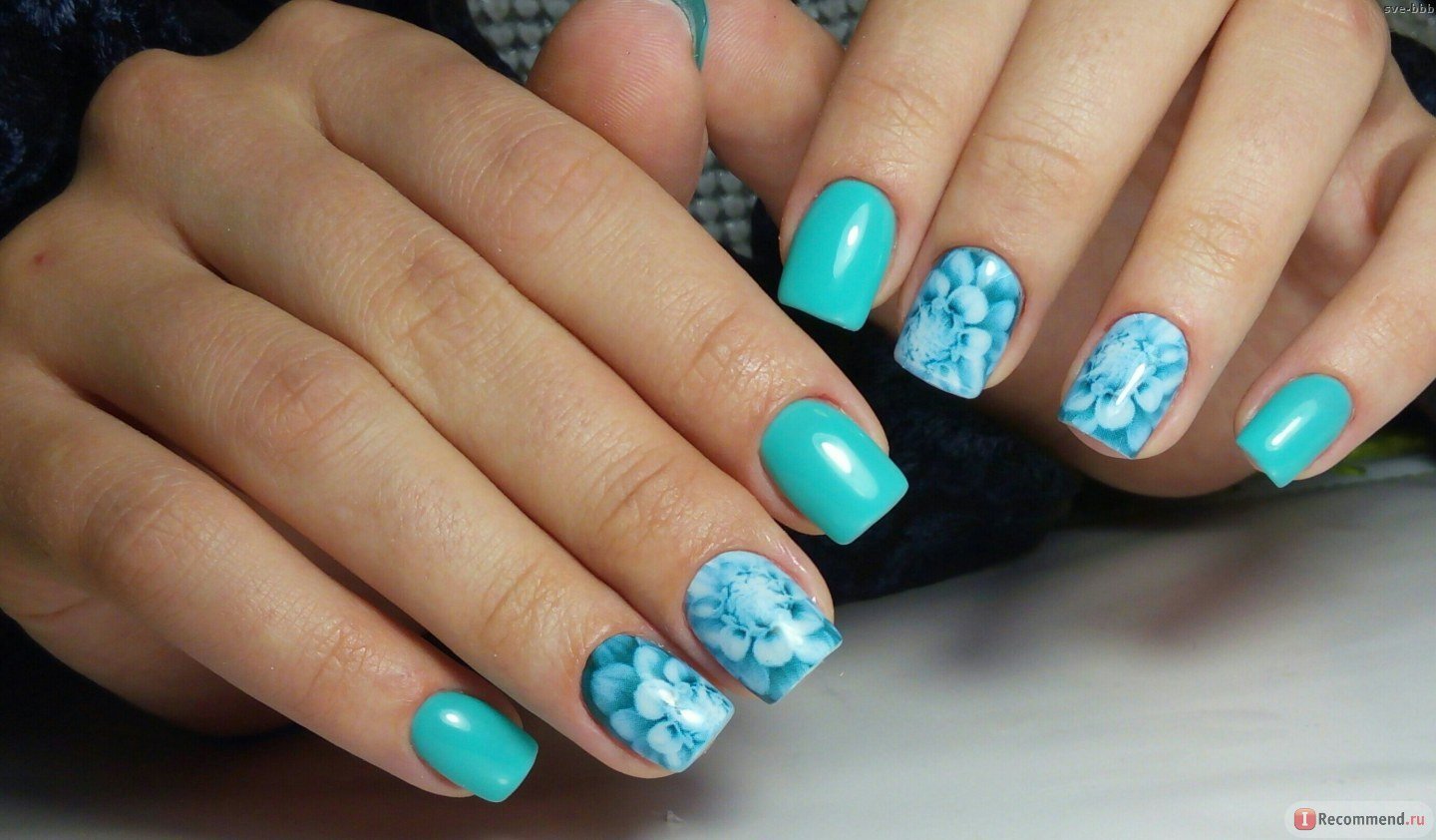 Вариантов маникюра с цветами огромное количество, поэтому экспериментируйте с узорами, добавляйте к бирюзовому светлые и темные тона и ваш маникюр перестанет быть простым и тривиальным.