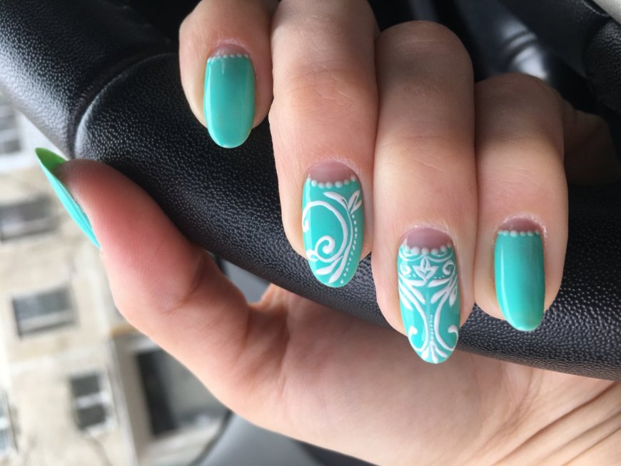 - Особенно эффектно смотрятся белые индийские узоры. Но и традиционная роспись в виде прозрачного кружева делает маникюр в бирюзовых тонах еще утончённее и свежее.