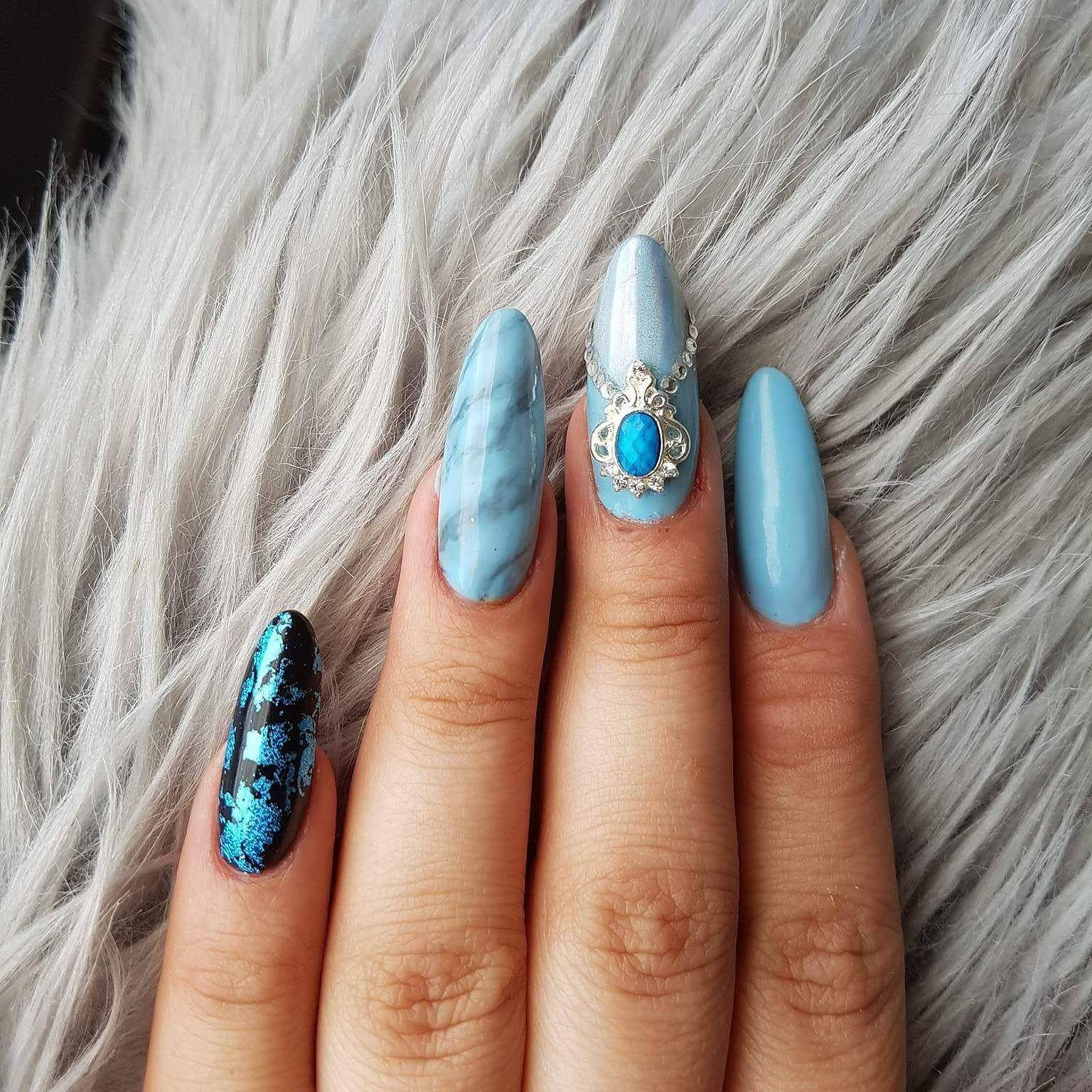 Особый стиль приобретает маникюр в бирюзовом цвете с интересным дизайном: под мрамор, «битое стекло», фольга, бархатный песок.