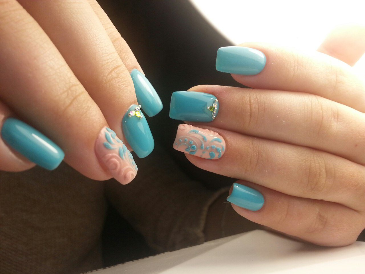 Они прекрасно дополняют маникюр с бирюзовым лаком. Если пластины короткие, квадратной формы, достаточно «положить» на них по одной бусинке. Когда ногти длинные, есть где разгуляться. Тут можно сочетать стразы разной величины или зарихтовать ими один из ногтей.