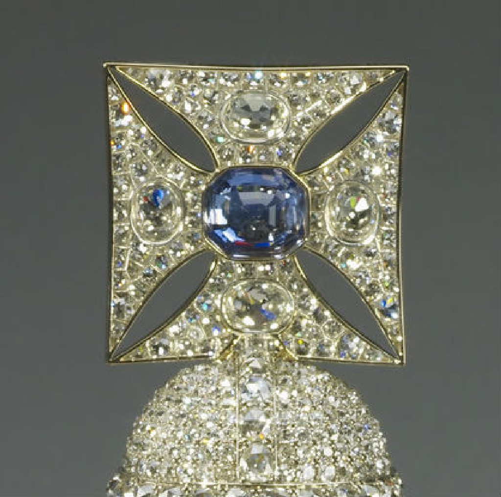 Более «древние» образцы различных сапфиров, которые купил Георг IV, тоже находятся на короне. На снимке под номером 4 на короне находится так называемый сапфир Стюартов, который ранее принадлежал Шотландии, но был присвоен в 1296-ом году Эдуардом первым во время вторжения в Шотландию.