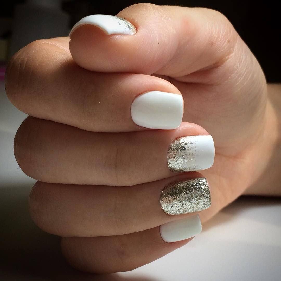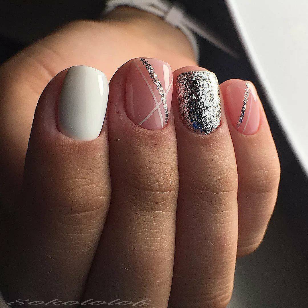 Спокойное сочетание нюда и белого играет по-новому, если один пальчик усыпать крупными блестками.