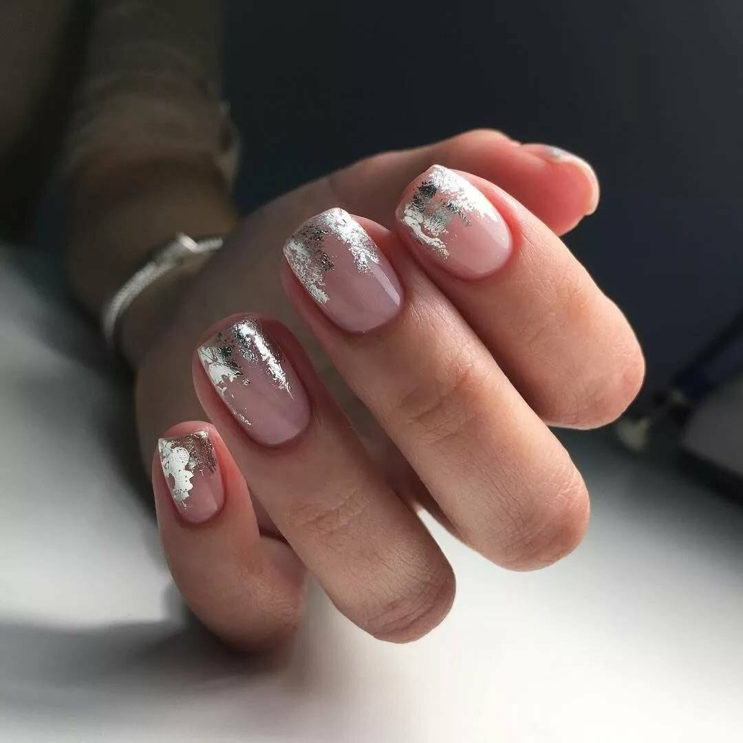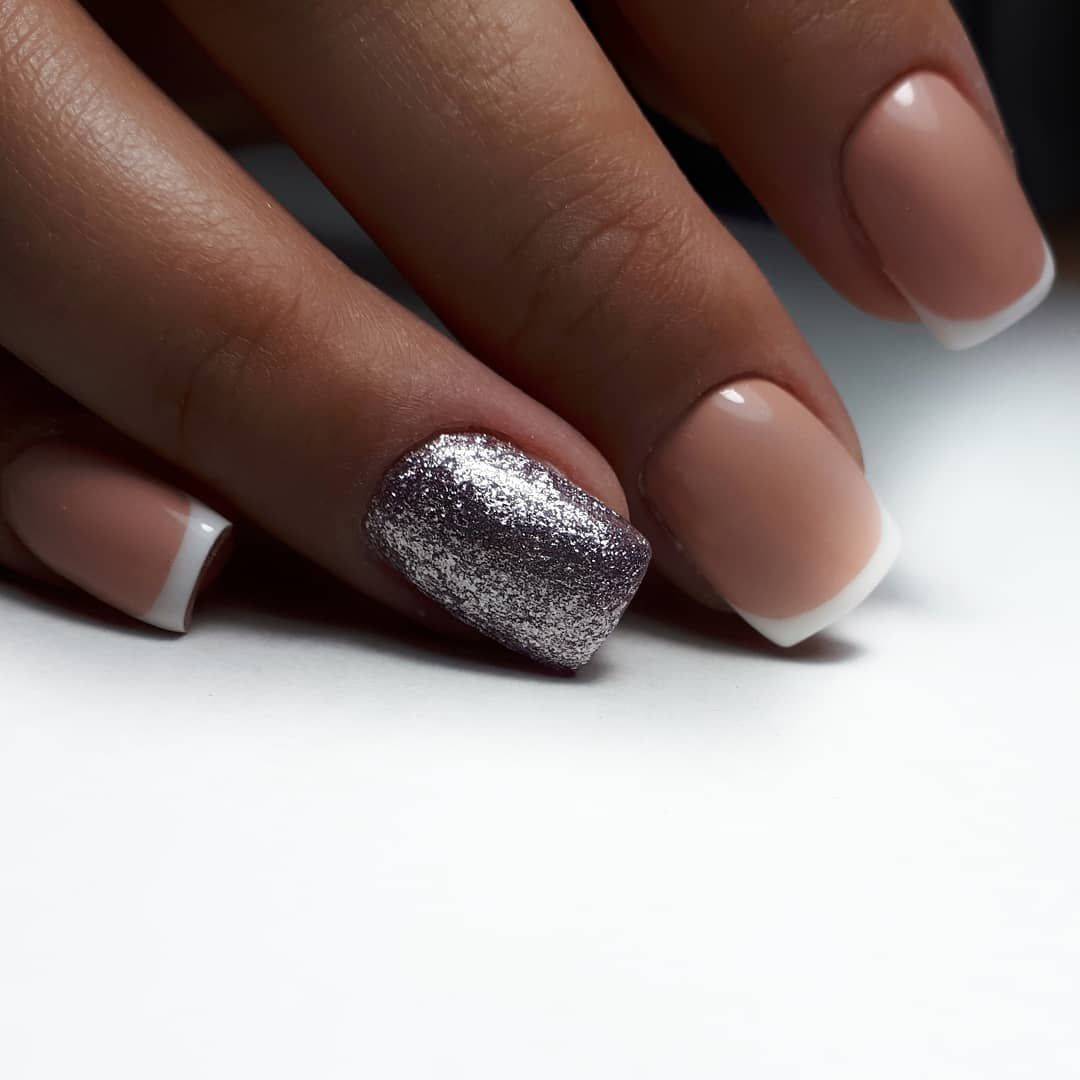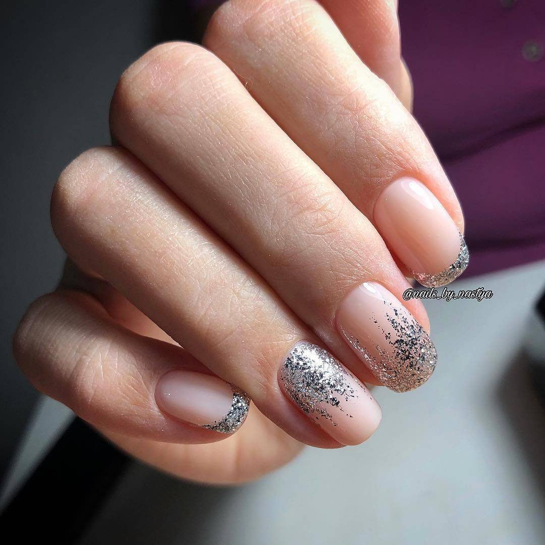 Чтобы связать блестящие и нюдовые ноготки – слегка задекорируй глиттером кончики. Получается сдержанный, но лаконичный праздничный маникюр на короткие ногти.