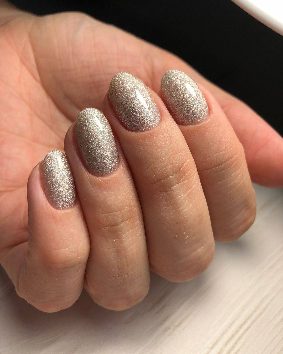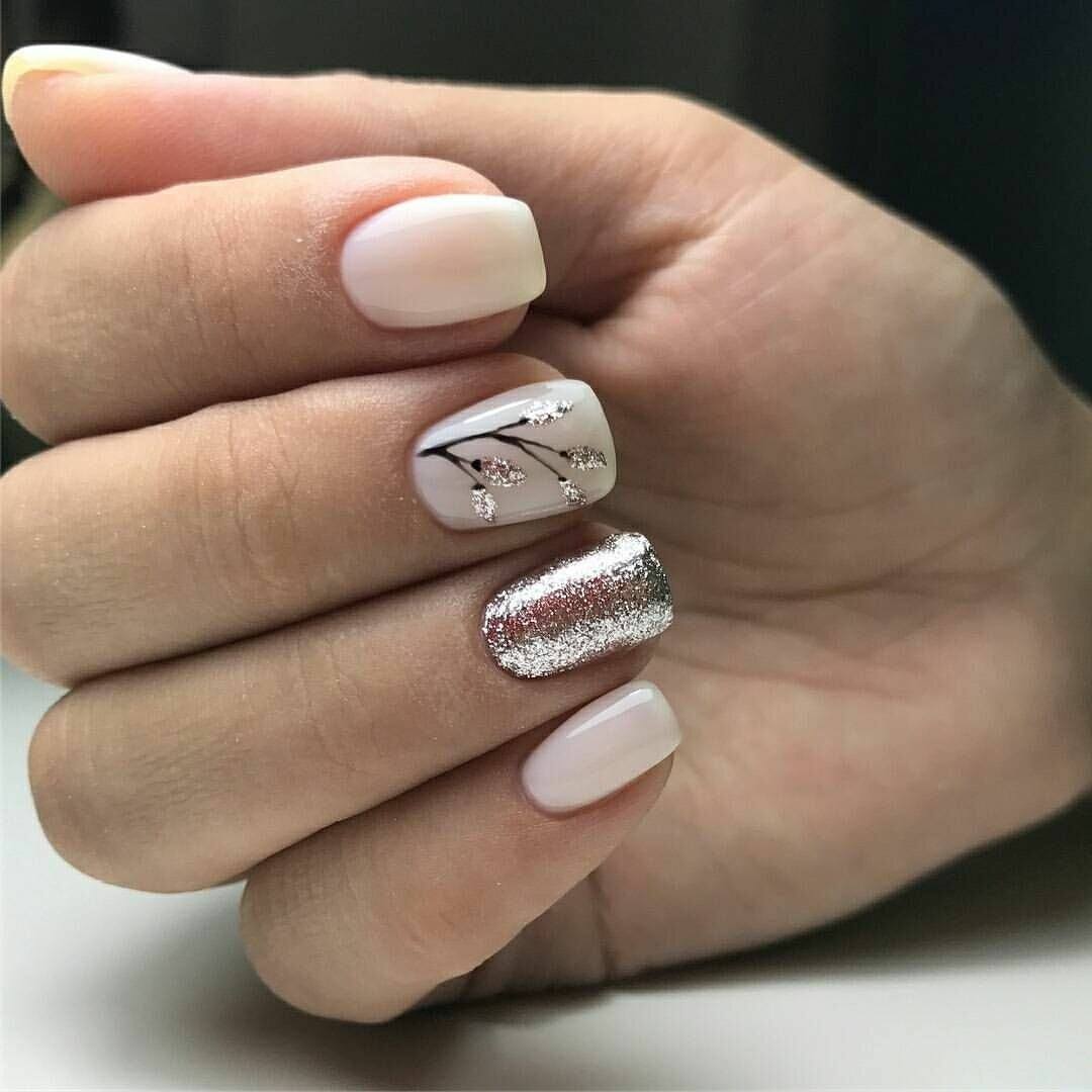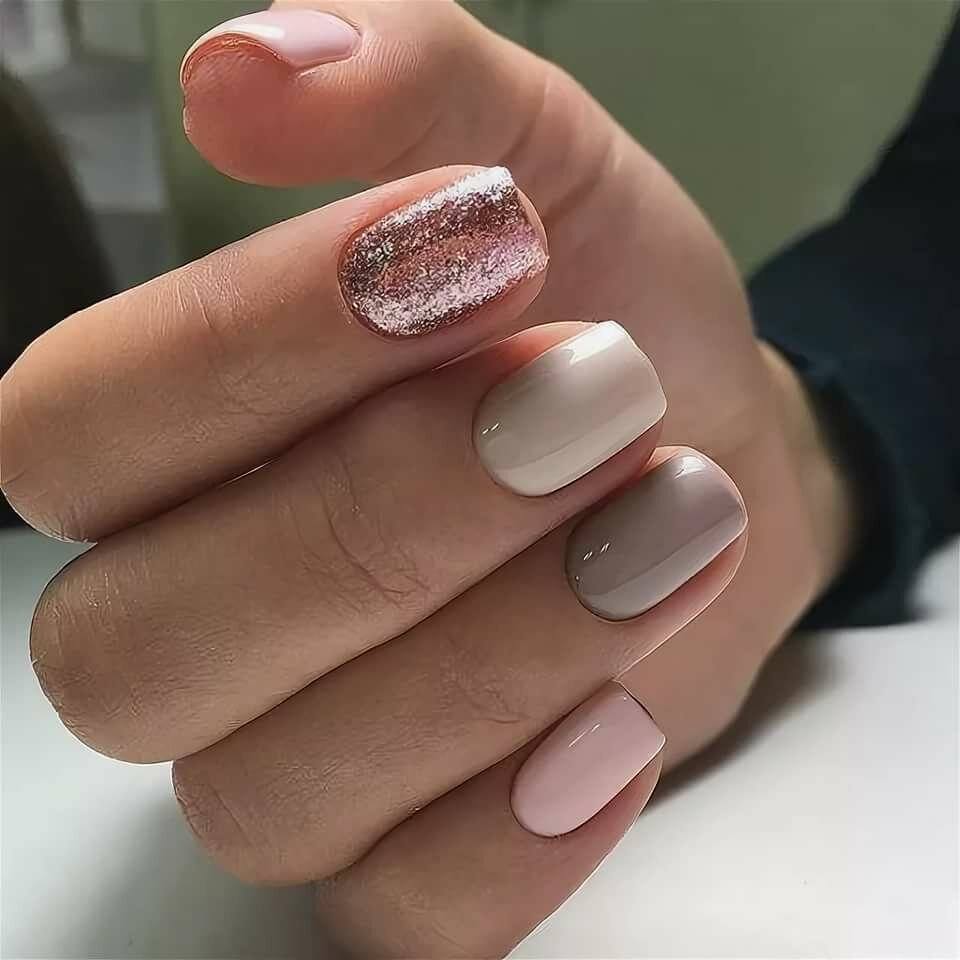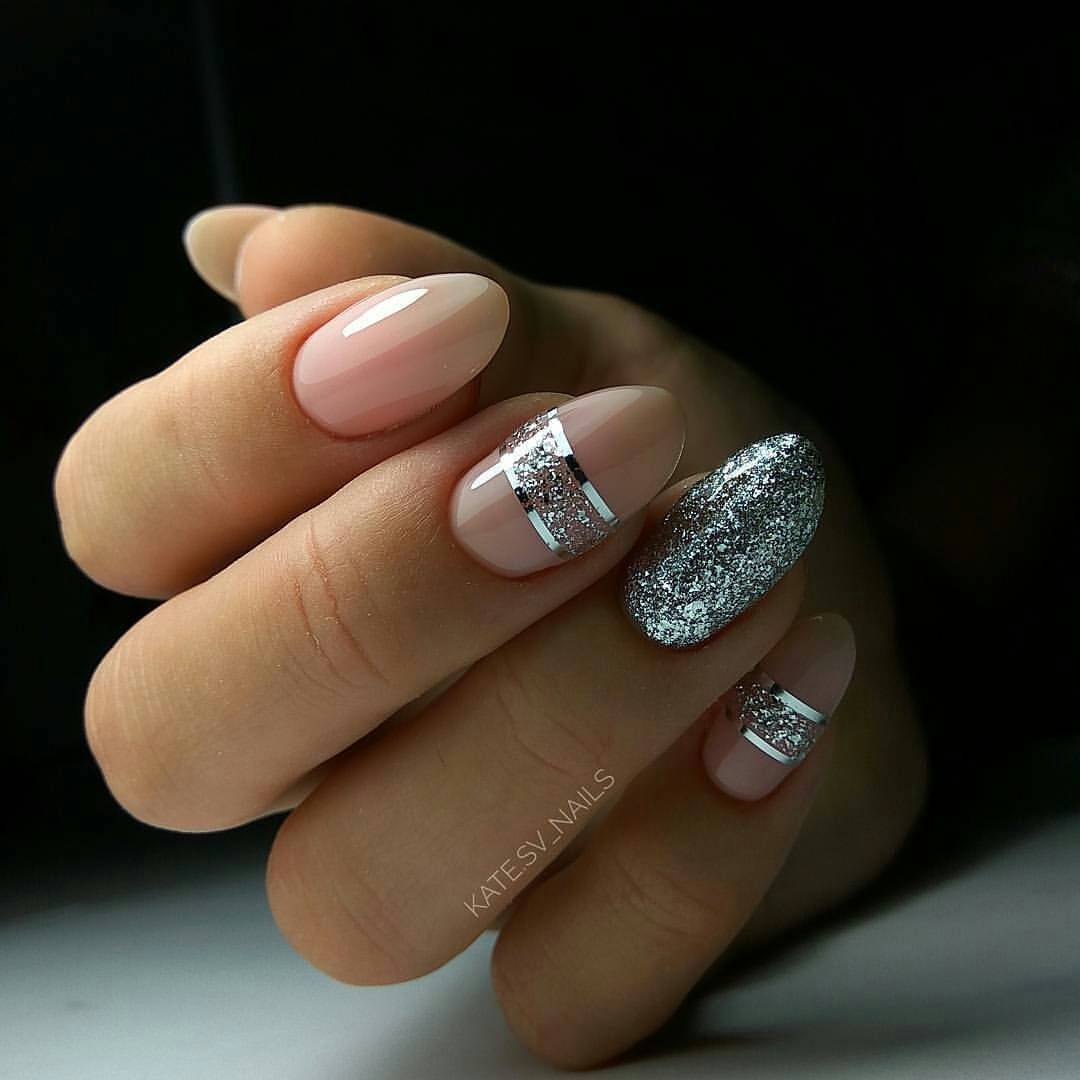 Чтобы связать блестящие и нюдовые ноготки – слегка задекорируй глиттером кончики. Получается сдержанный, но лаконичный праздничный маникюр на короткие ногти.