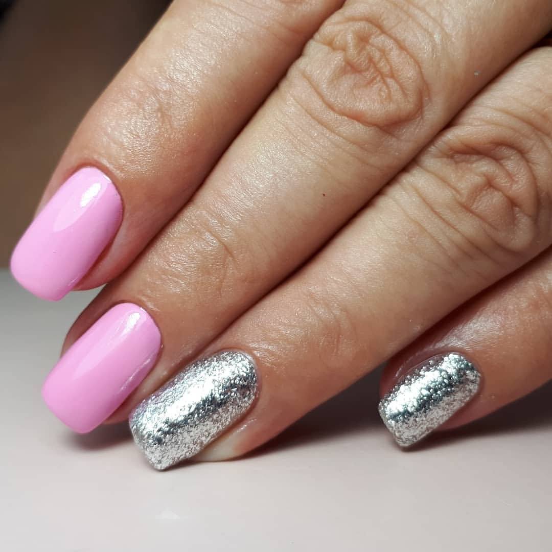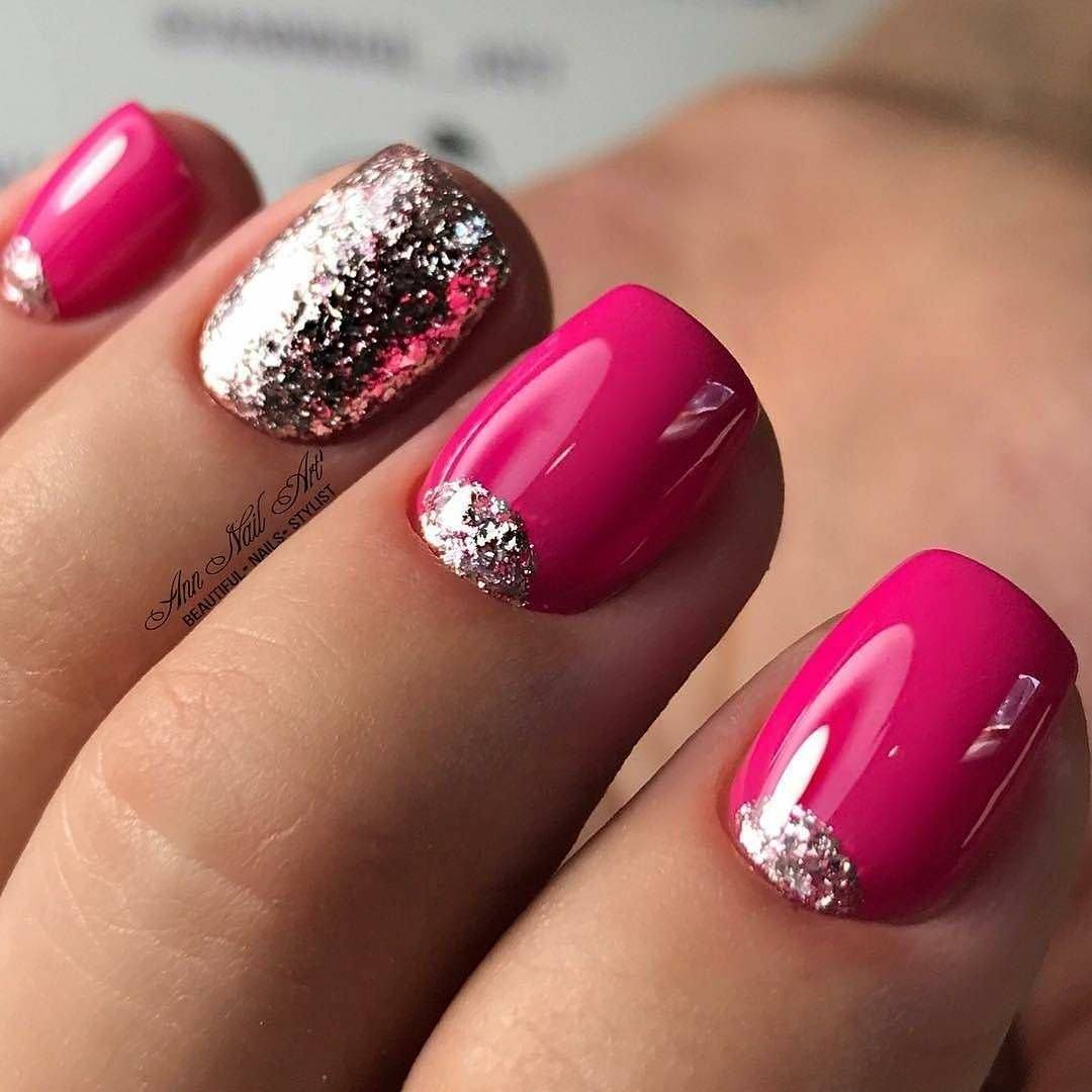 Розовый цвет лояльно относится абсолютно к любому декору. Это могут быть строгие геометрические формы, легкие летние узоры с фруктами, цветами. Все эти узоры можно дополнить гель-лаками с глиттером или окрасить 1-2 ноготка на руке сплошным слоем глиттера.