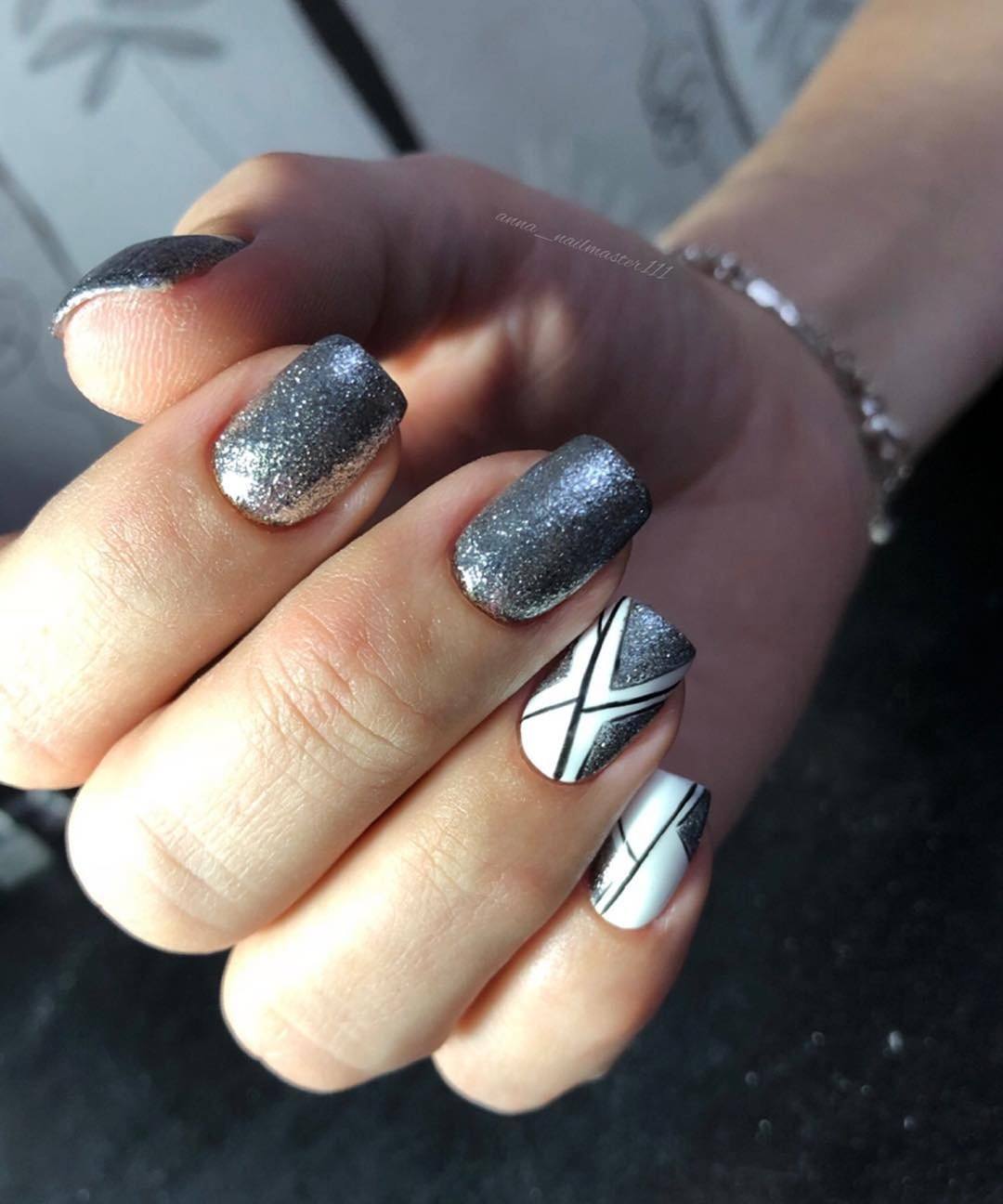 Геометрические дизайны продолжают занимать место в списке трендов, поэтому находят отражение и в маникюре с глиттером – линии, фигуры, точки – все это уместно для модного дизайна ногтей.