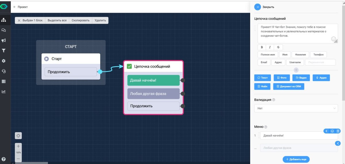 Возвращаемся в конструктор Leadtex. Разговор с ботом начинается с кнопки /start. Первый блок создается автоматически.