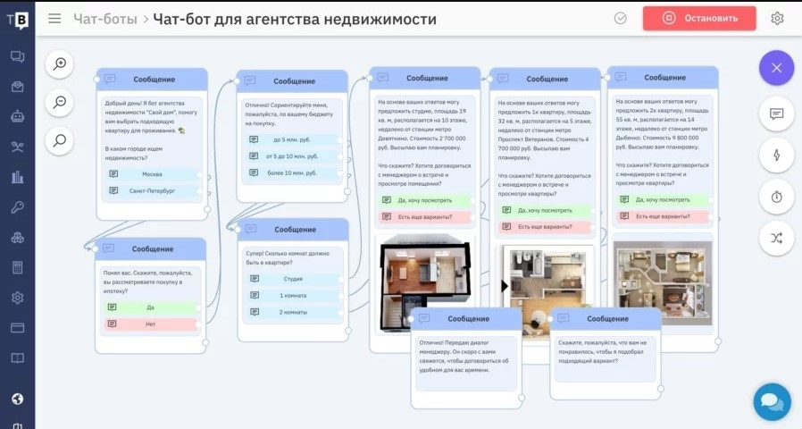 Пример функционала чат-бота в сфере недвижимости, где бот уточняет — в каком городе клиент ищет недвижимость, рассматривает ли покупку в кредит, сколько комнат хочет, в пределах какого бюджета рассчитывает сделку и т. д.