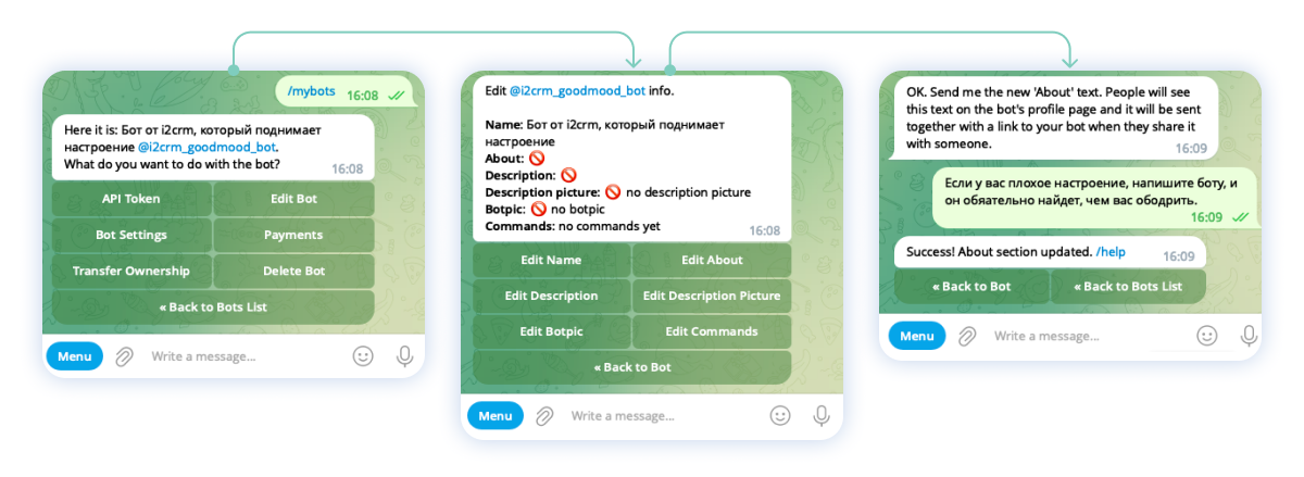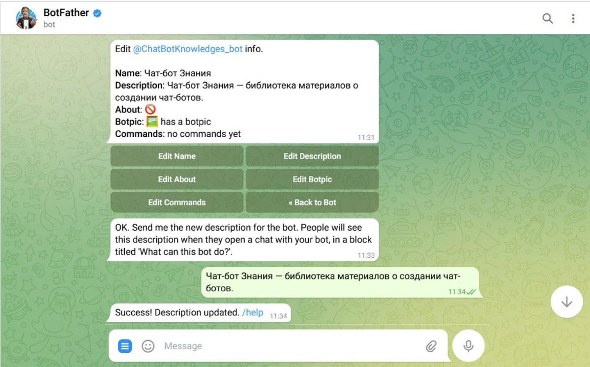 В «BotFather» введите команду /mybots, чтобы выбрать бот, с которым планируете работать сейчас, а после нажмите на кнопку «editbot». Затем следует нажимать на каждую из предложенных кнопок, чтобы добавить описание бота, картинку для описания и аватарку бота.