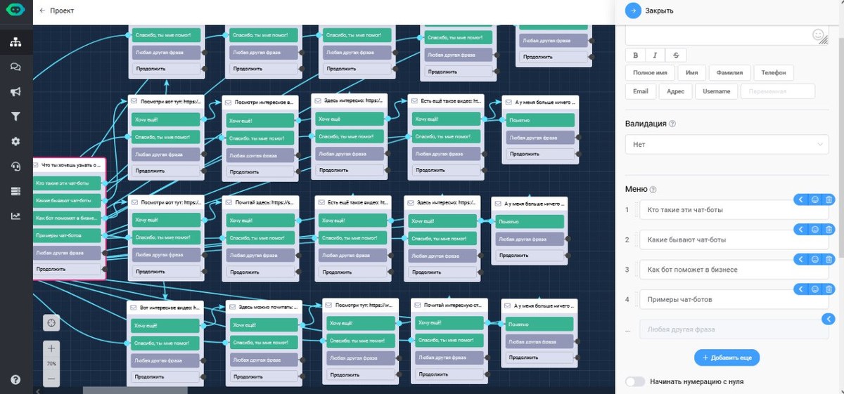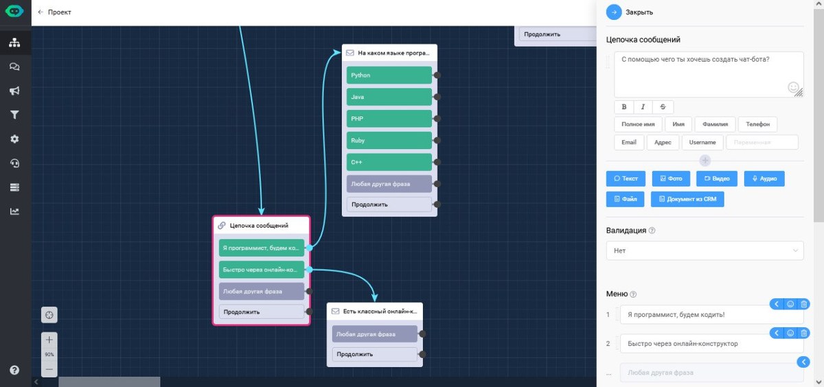 Мы уже писали про онлайн-конструкторы ботов и собирали тестового бота в одном из них. С таким подходом мы решаем большинство проблем из первого варианта: