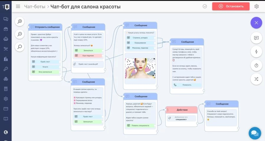 В бьюти нише. Здесь можно настроить программу так, чтобы бот отвечал на часто задаваемые вопросы об услугах и ценах, уведомлял об акциях и спецпредложениях, отправлял портфолио работ мастеров. Также полезно будет подготовить текстовый контент о продолжительности процедур, оказываемых в салоне красоты. Дополнительно можно встроить функционал записи клиентов на стрижку или маникюр.