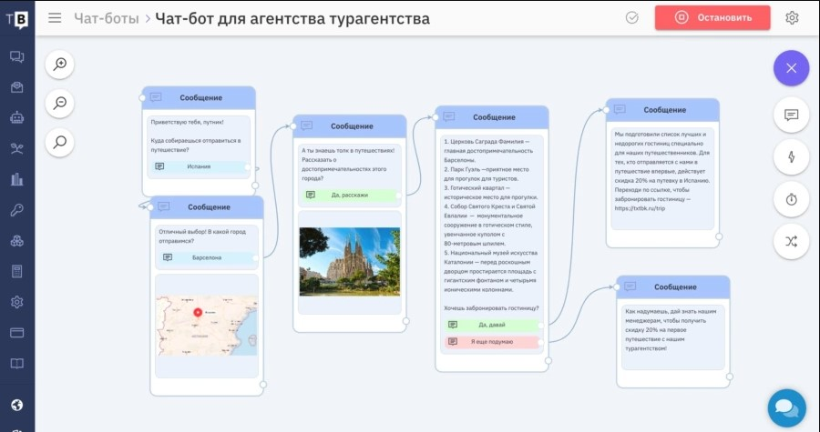 В нише тревела. В этом бизнесе нужно всегда быть онлайн, чтобы не упустить клиентов. Поэтому чат-бот здесь — просто необходимость. Программа будет на связи 24/7 и поможет автоматизировать подбор туристических путевок или продажу билетов. Кроме того, чат-бот расскажет о курортах, поможет квалифицировать клиента, покажет лучшие отели разных стран и учтет различные пожелания клиентов.