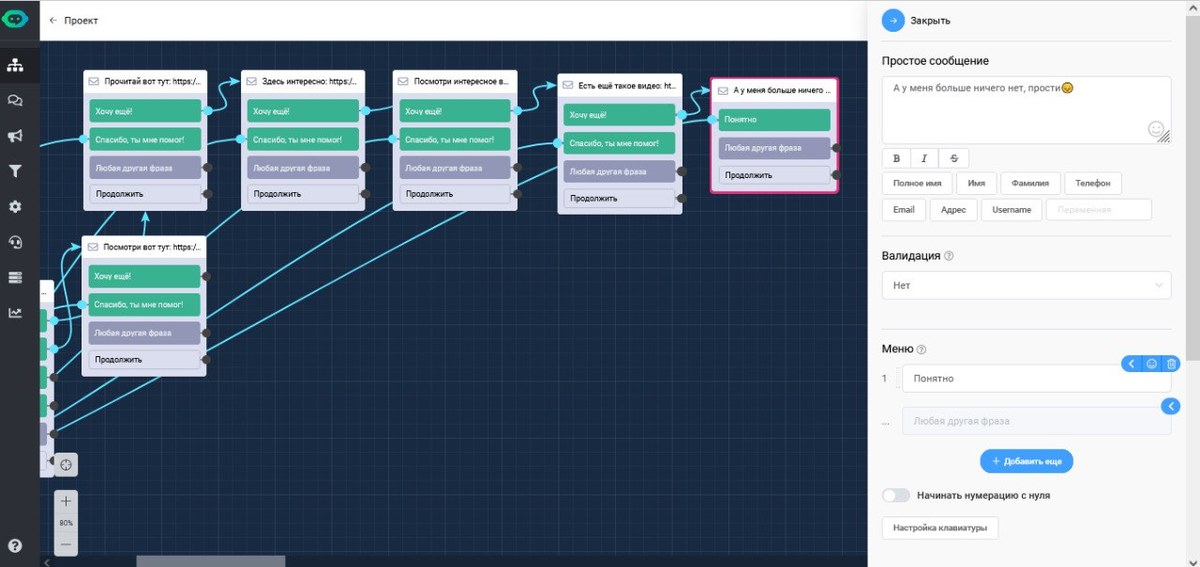В последнем блоке (если пользователь несколько раз нажимал «Хочу еще») вместо ссылки ставим фразу «А у меня больше ничего нет». И делаем этот блок финальным — залинкуем его с блоком «Что тебе интересно узнать о чат-ботах?».