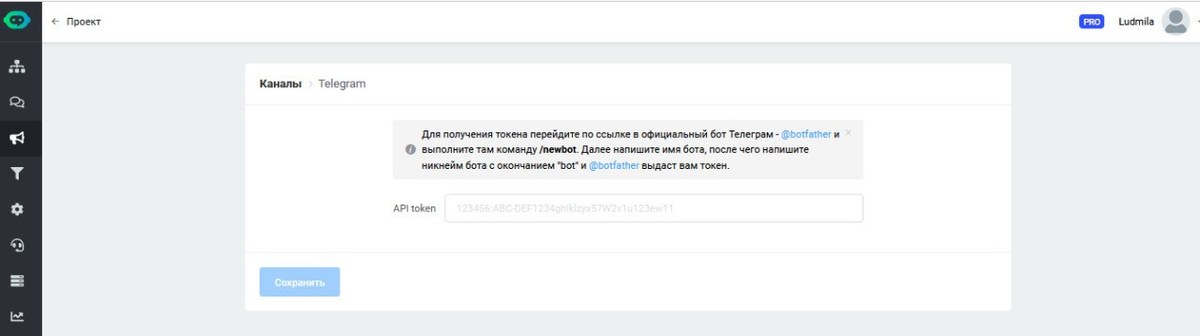Нажимаем на кнопку и добавляем токен бота из BotFather в специальное поле. После чего нажимаем кнопку Start.