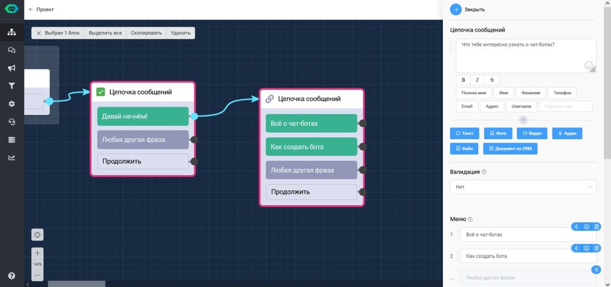 Создаем следующую цепочку сообщений с двумя вариантами ответа. Так в боте пользователь сможет выбрать тему, которая ему интересна: базовая информация о чат-ботах или информация о том, как их создать.