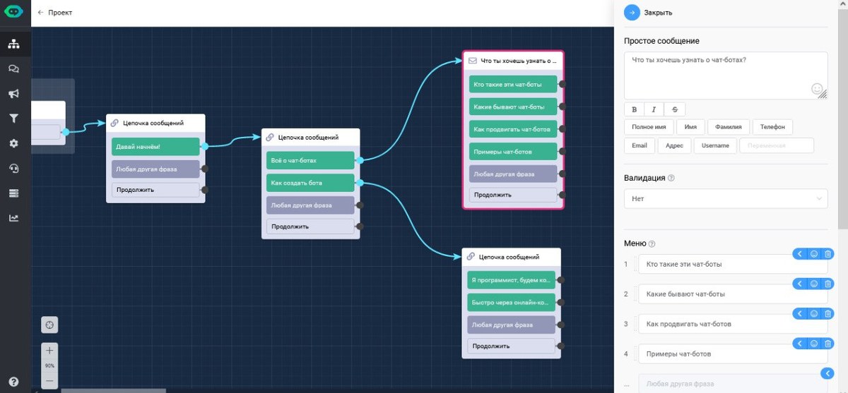 Для создания простых ботов можно использовать сервисы-конструкторы. С их помощью получится реализовать наиболее частые сценарии использования: ответы на вопросы, выдачу информации по запросу и обработку данных пользователя. Такие сервисы не требуют знания программирования, их можно освоить за несколько часов.