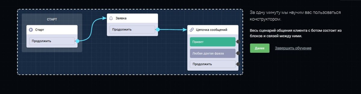 Выбор типа бота помогает конструктору подобрать макет. Тут же сервис предлагает пройти обучение и узнать о функционале программы.