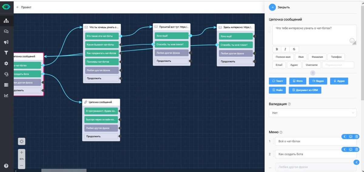 botmother — редактор ботов, который умеет работать не только с Telegram, но и с другими популярными мессенджерами. Есть возможность обрабатывать медиа, файлы и обращаться к сторонним сервисам.