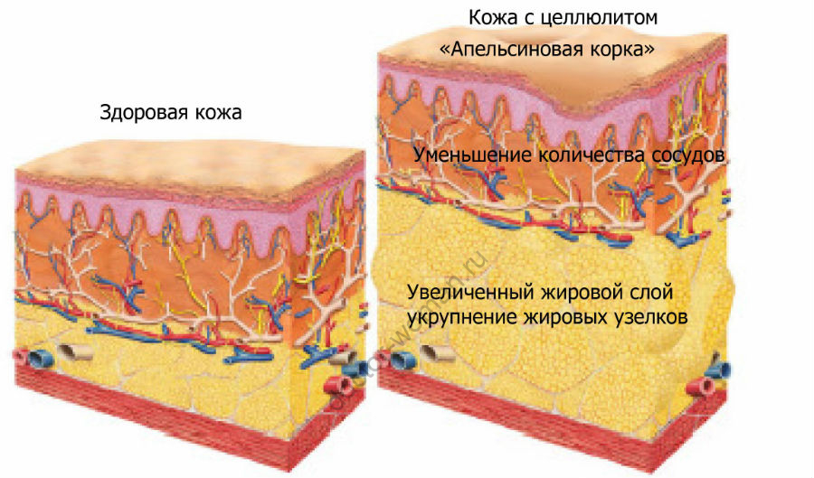При целлюлите подкожные жировые клетки, не находя себе места из-за увеличившегося объема волокон соединительно-тканных перегородок, вытягиваются вверх и оказывают давление на дерму. В результате на поверхности эпидермиса образуются бугры, похожие на апельсиновую корочку.