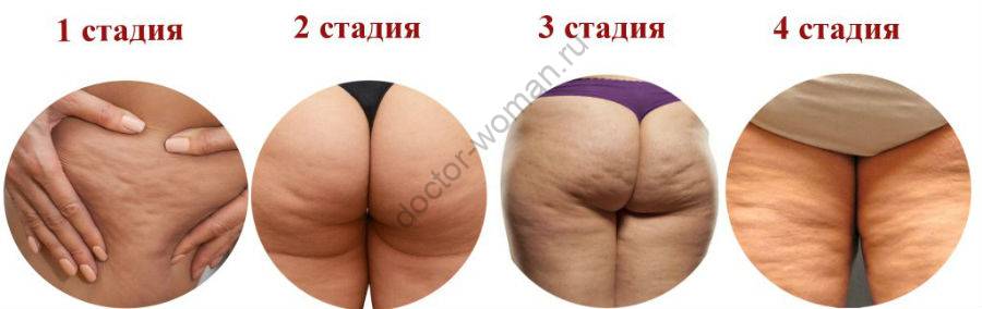 Типы апельсиновой корки зависят от стадии ее развития, способа ее образования и твердости кожи. Чаще всего целлюлит делится на четыре стадии развития: