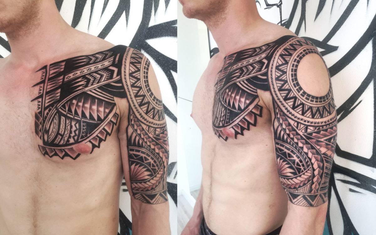 Здесь чаще всего изображают реалистичные, объемные эскизы на теле, что расставляют акценты на физической силе обладателя. Сюда наносят разные доспехи, оскал дикого зверя, птиц с расправленными крыльями и др.